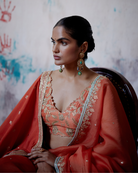 Description: Rust orange organza saree is a stunning blend of traditional craftsmanship and contemporary style. It features a delicately embroidered border that runs gracefully along the entire length, enhanced by a striking contrast blue edging that adds depth and elegance.
