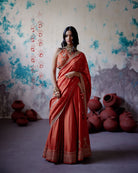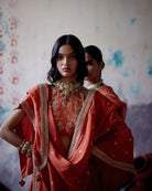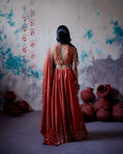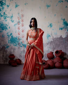 Description: Rust Orange Lehenga set is crafted from luxurious silk, showcasing our signature embroidered motif meticulously placed on each kali, complemented by a richly detailed heavy embroidered border that adds depth and elegance.