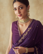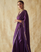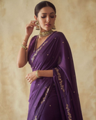 Description: Featured here is our Aubergine sari with hand embroidered aari details on the sari and palla. The sari is paired with a V neck blouse in silk.