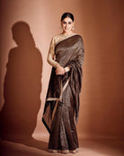 Description: Featured here is our black zari striped saree with hand embroidered border. The saree is paired with embroidered metallic full sleeves blouse.