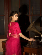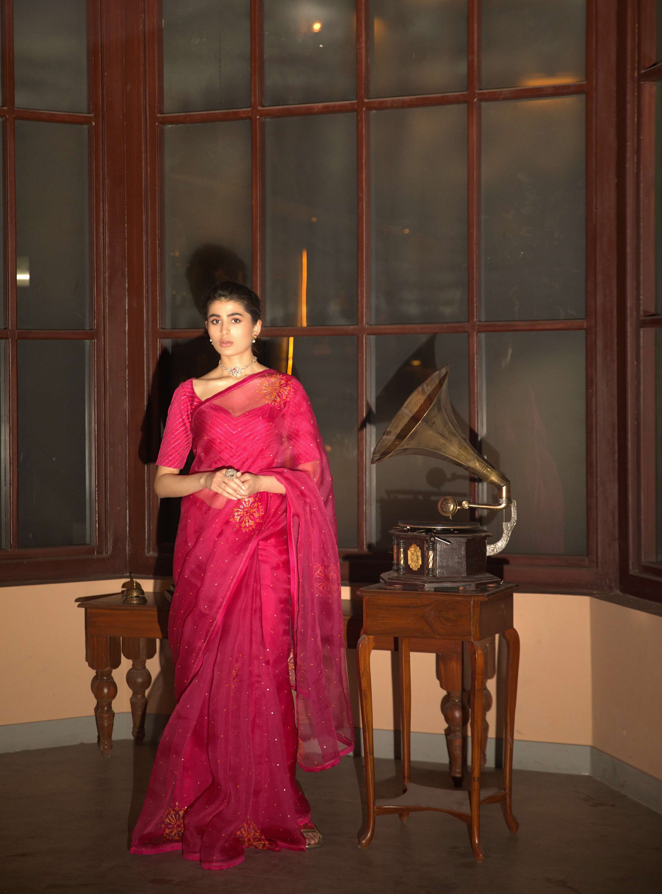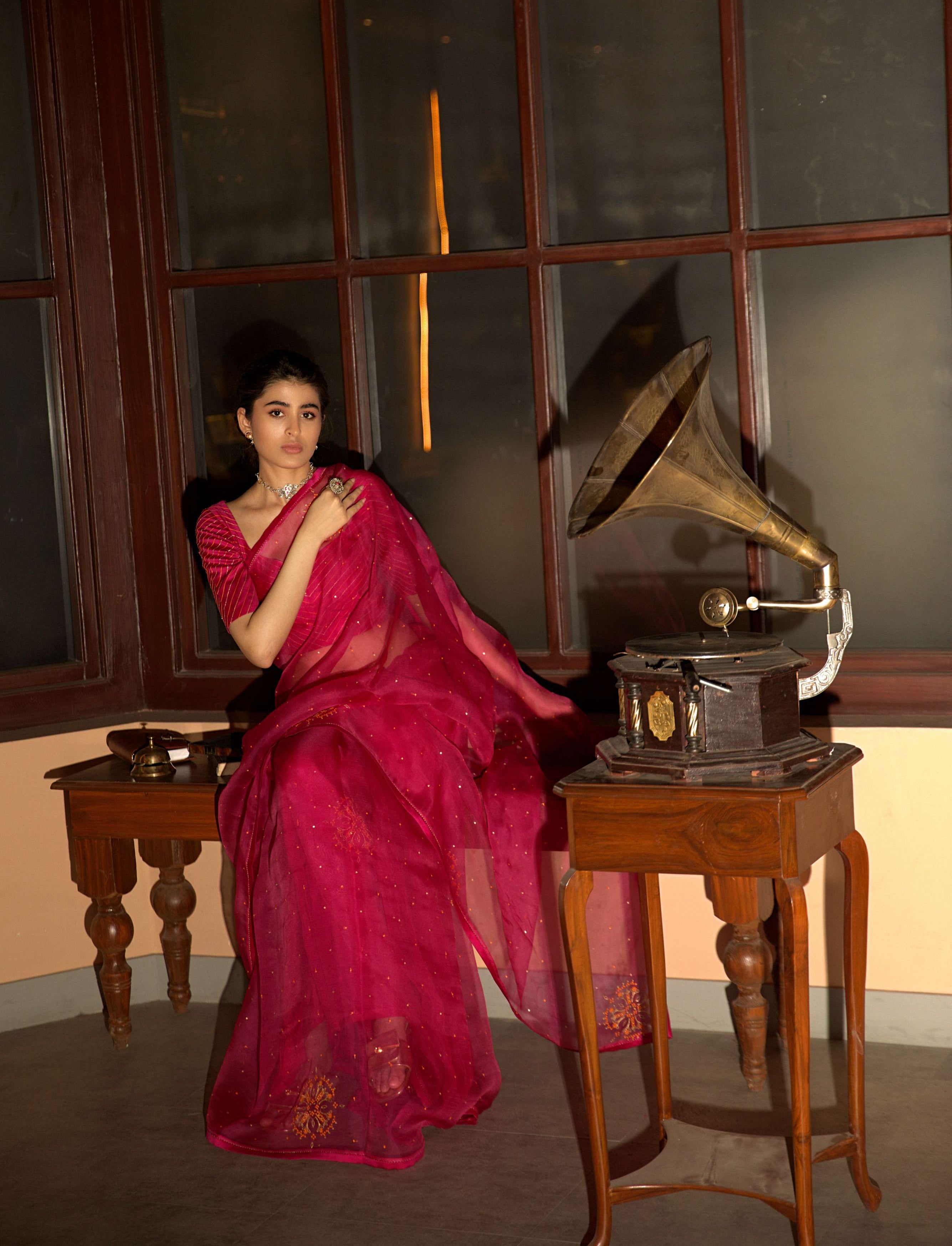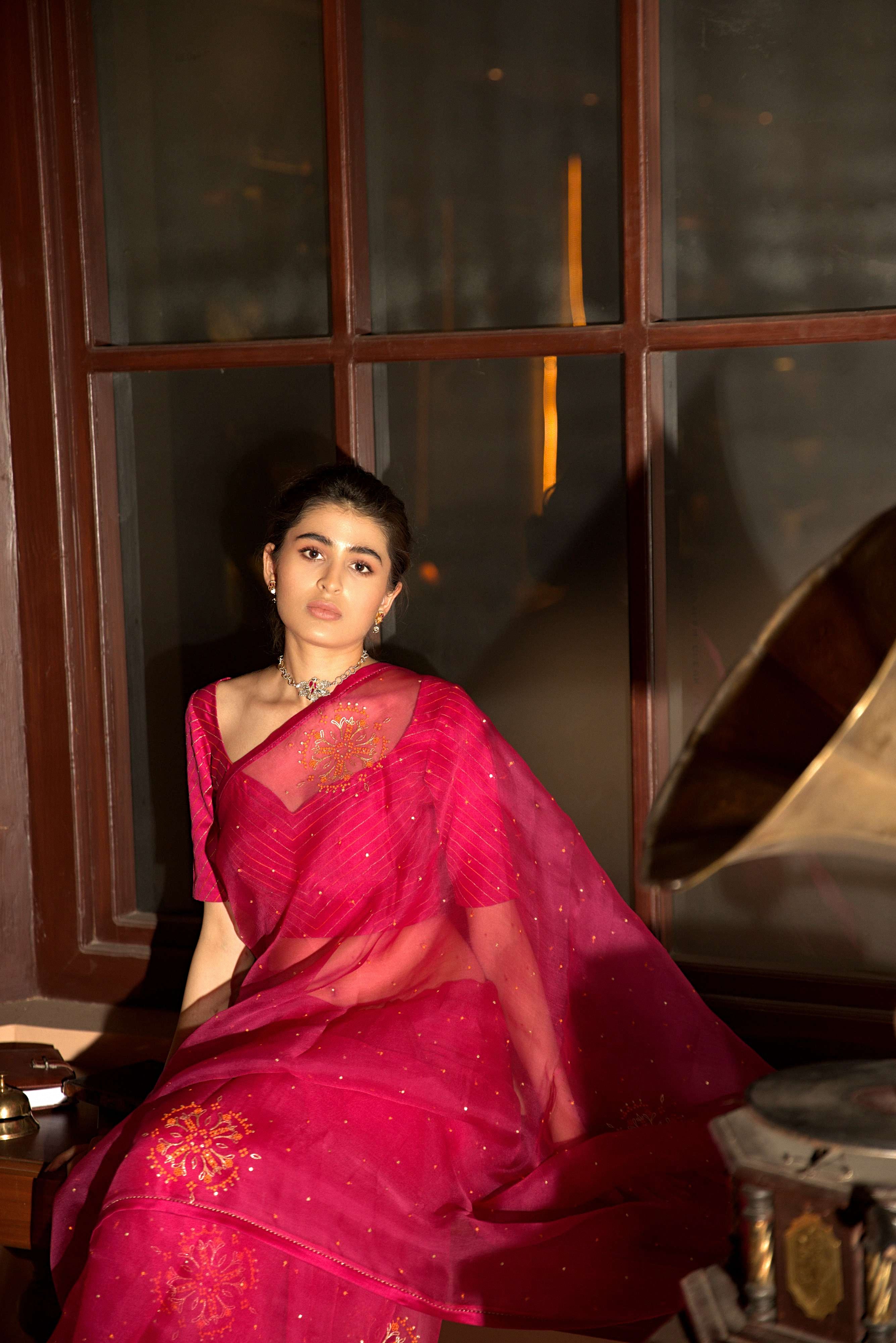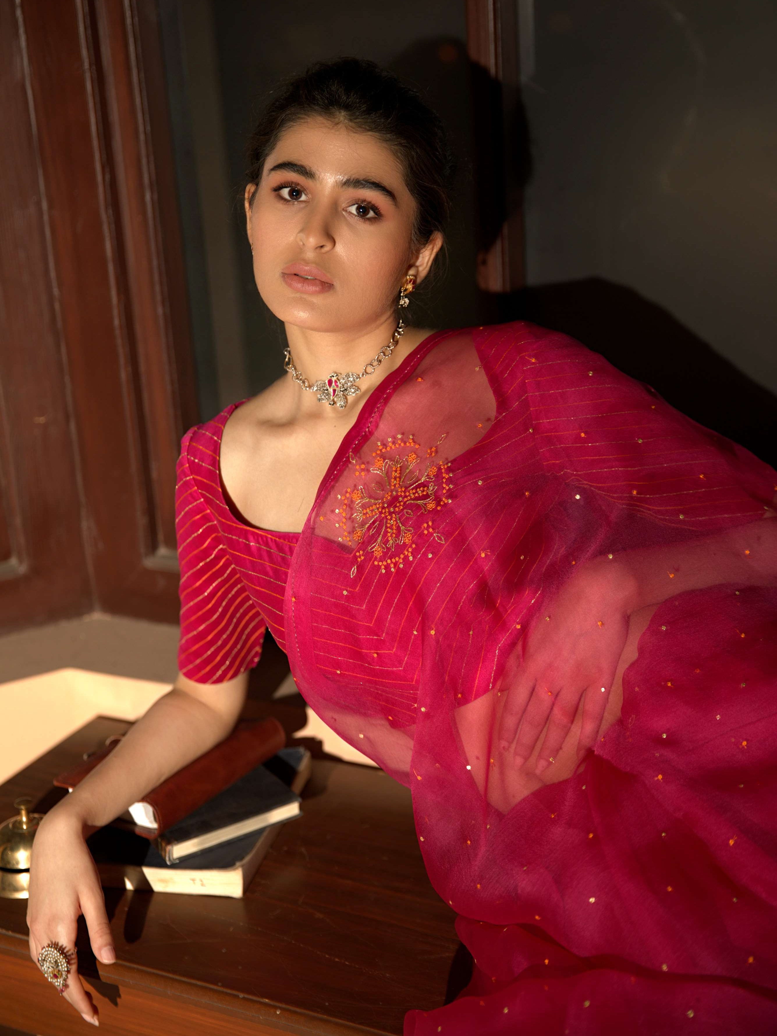 Description: Featured here is our fuchsia pink organza saree with contrasting hand embroidered buttas all over. The saree is paired with a blouse featuring embroidered lines all over.