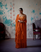 Description: Fuchsia draped saree crafted from fine chiffon showcases a pre-draped skirt design complemented by an attached palla for effortless elegance. Paired with a hand-embroidered blouse, it combines traditional craftsmanship with contemporary style, offering a refined and graceful ensemble suitable for special occasions Mehendi and Sangeeth.