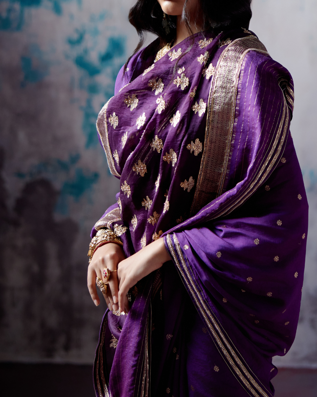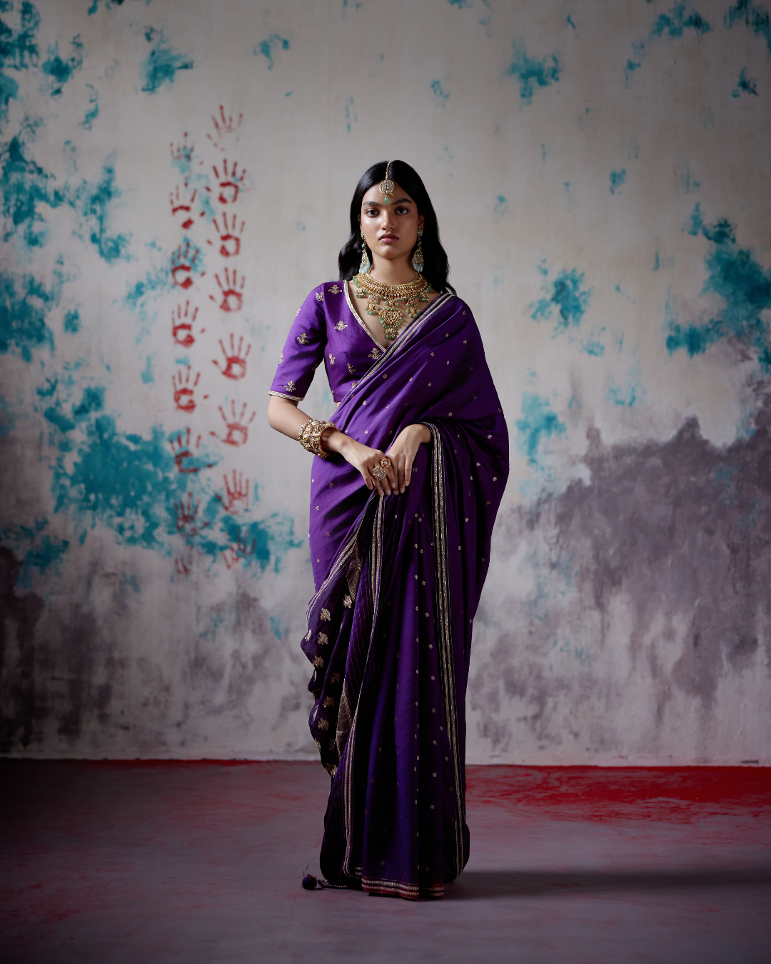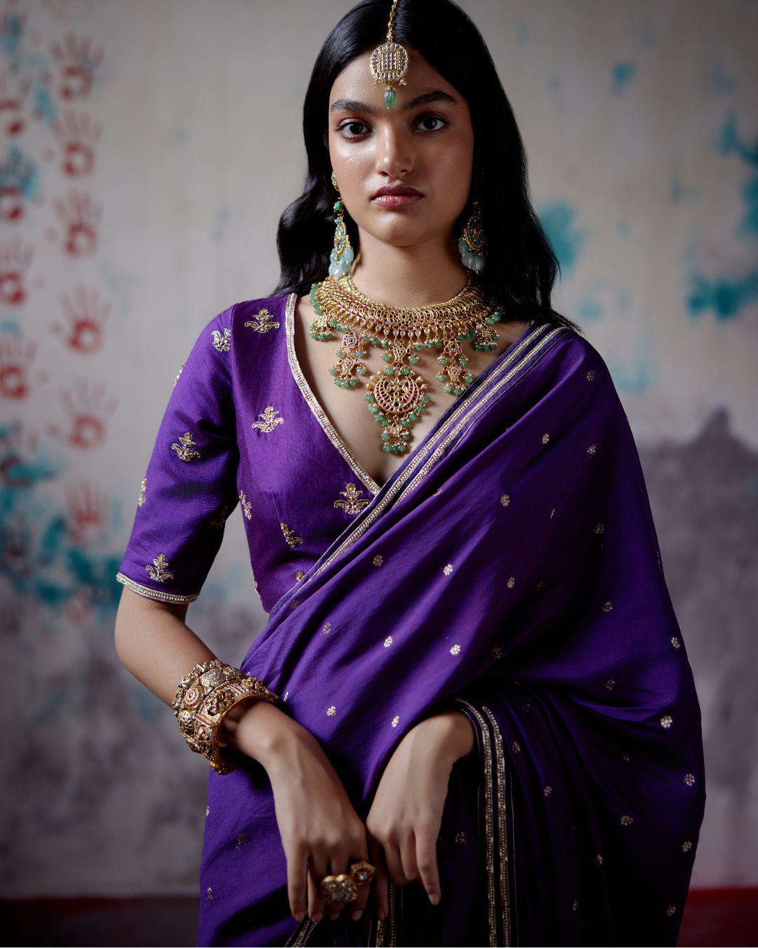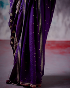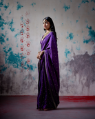 Description: Purple silk saree showcases craftsmanship with its richly woven brocade palla and delicate hand-embroidered buttis spread elegantly across the fabric. This luxurious saree is designed to offer a perfect blend of traditional artistry and contemporary style.