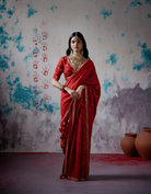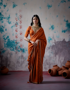 Complemented by a deep V-neck brocade blouse, it enhances the overall regal appeal, making it an ideal choice for festive occasions and special events. The fine silk material ensures a graceful drape and comfortable wear, reflecting both elegance and timeless beauty.