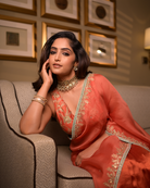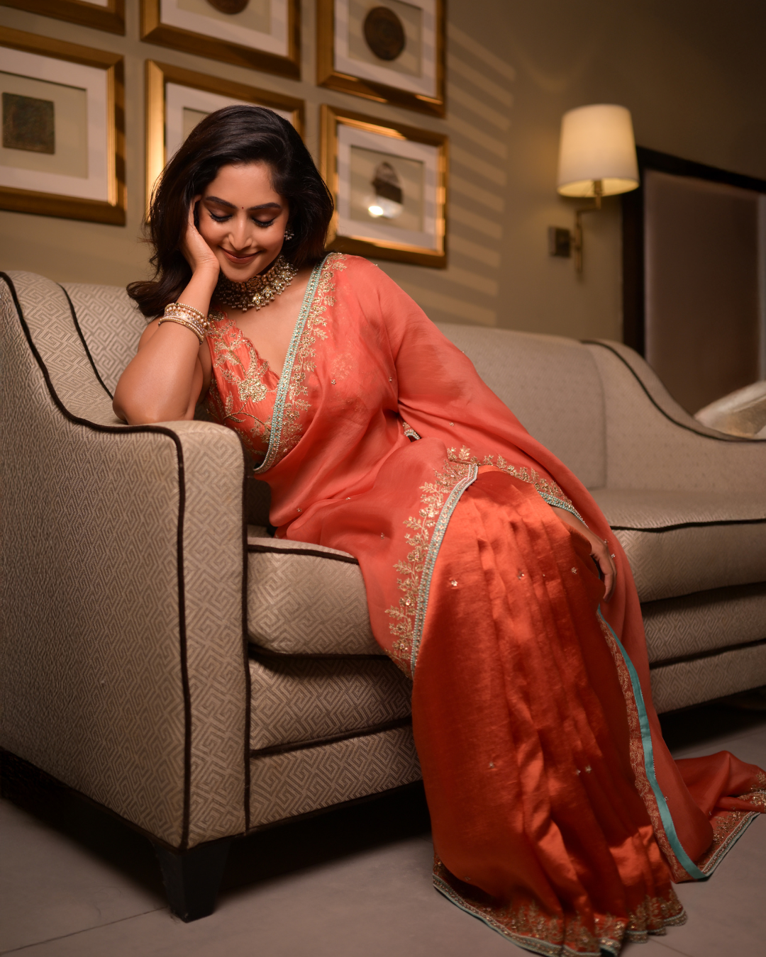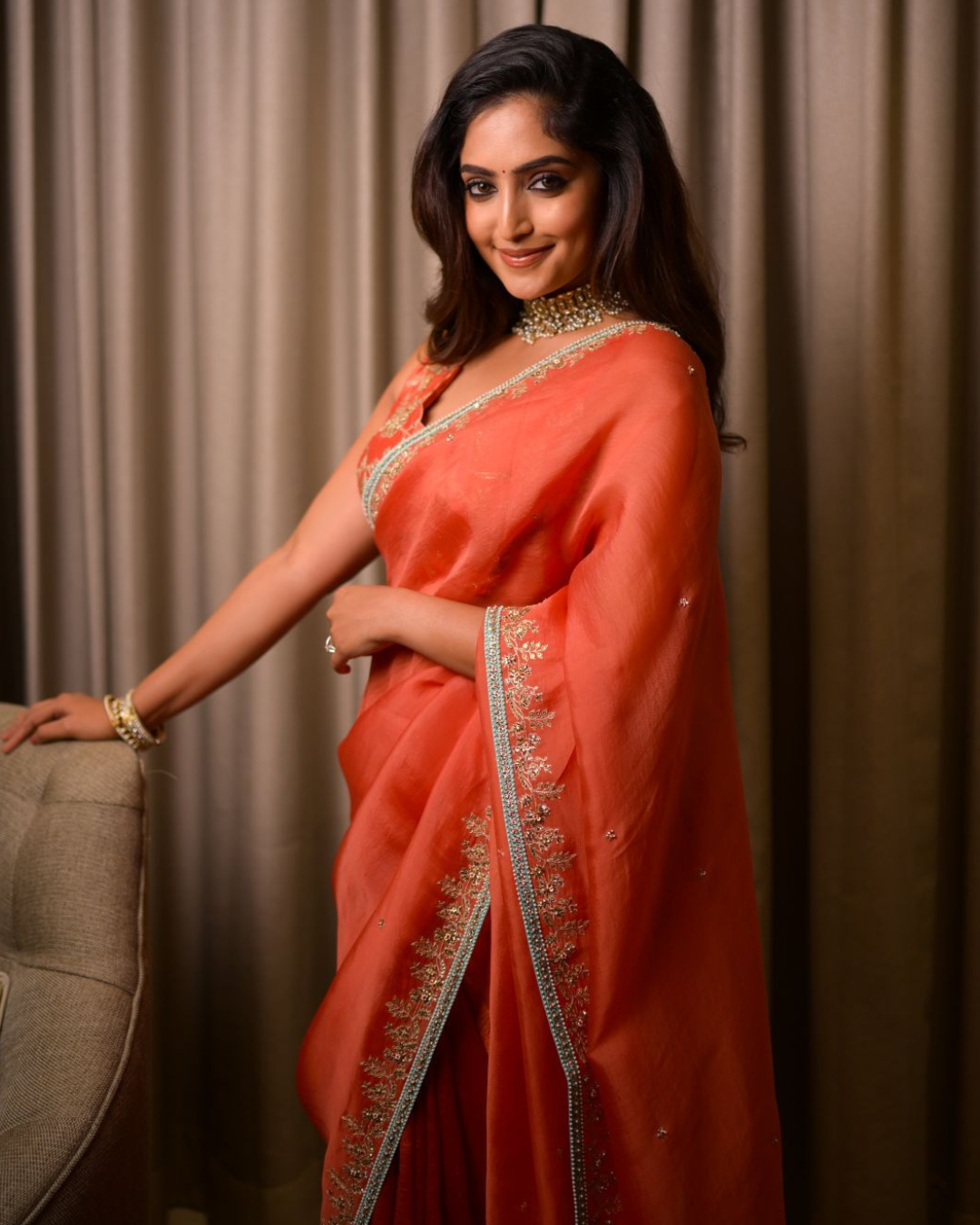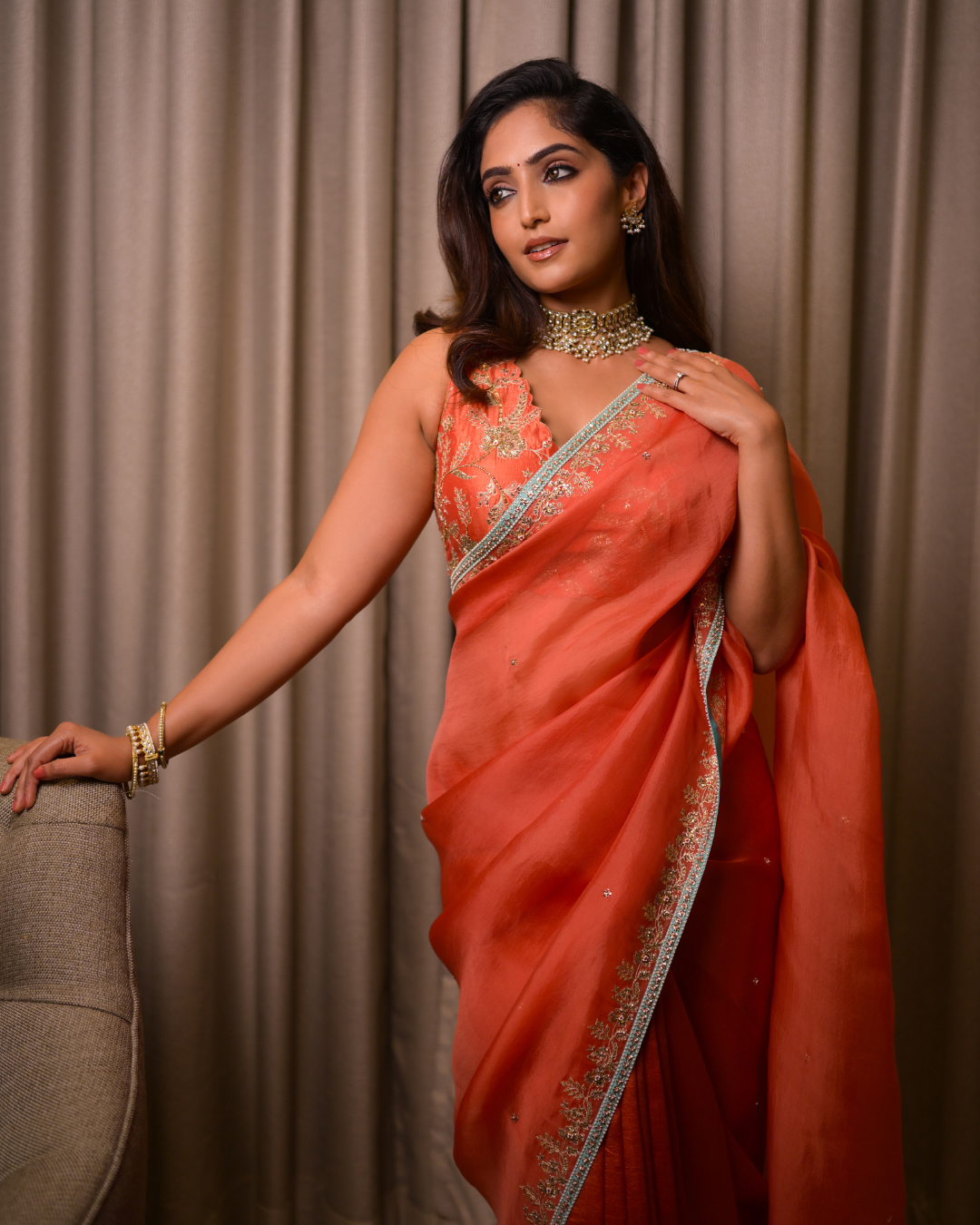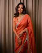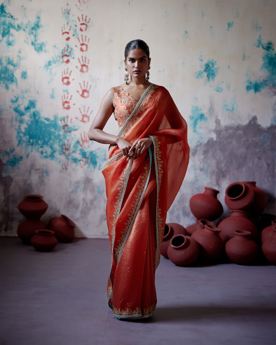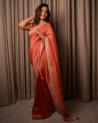 Description: Rust orange organza saree is a stunning blend of traditional craftsmanship and contemporary style. It features a delicately embroidered border that runs gracefully along the entire length, enhanced by a striking contrast blue edging that adds depth and elegance.