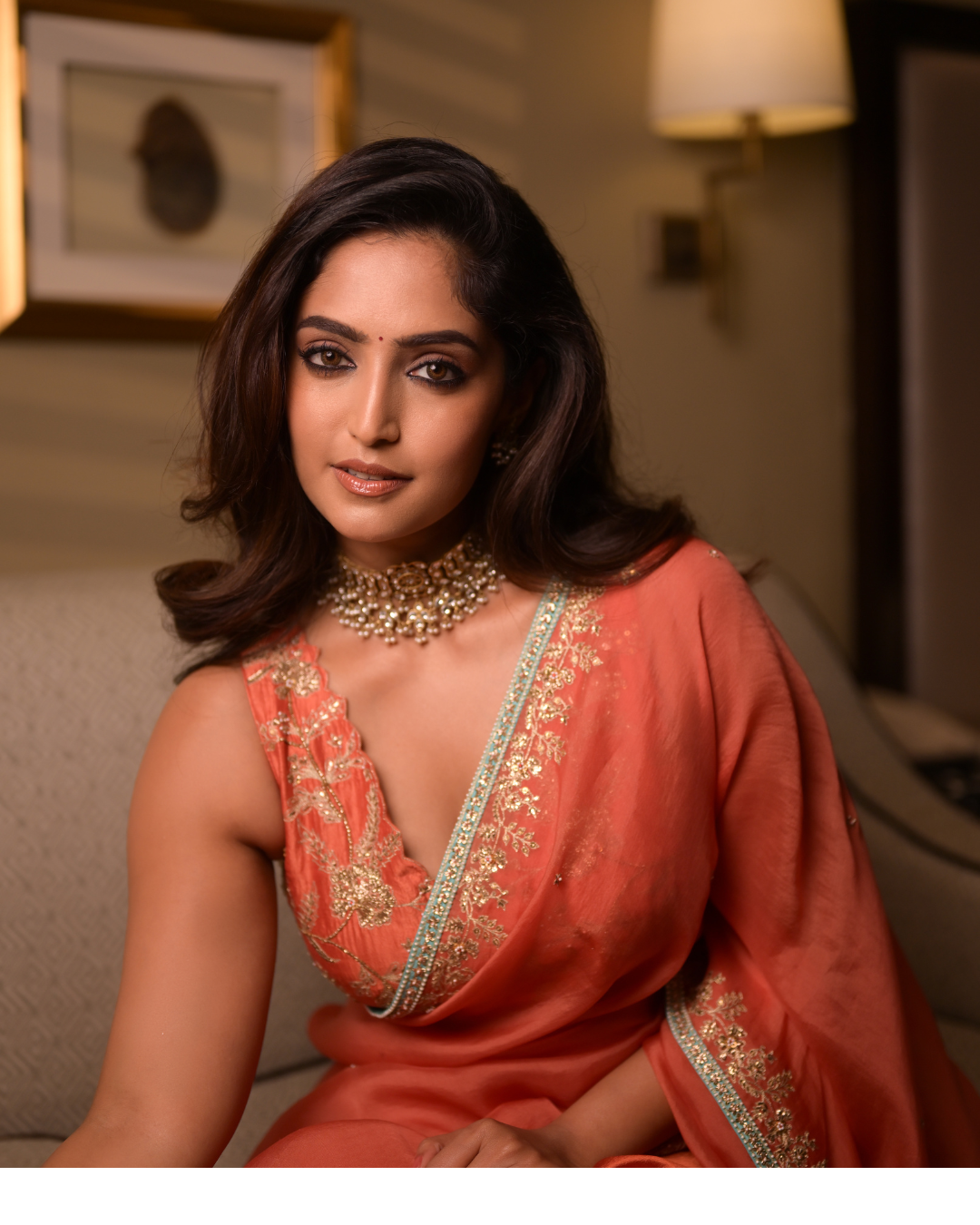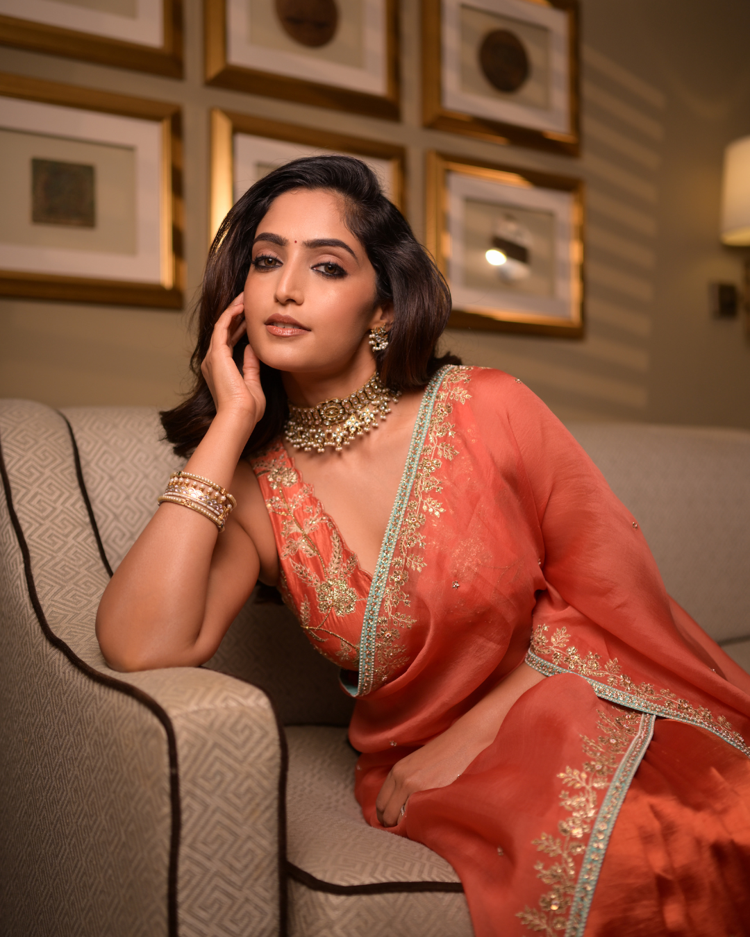 Complementing the saree is a deep V-neck blouse, meticulously adorned with intricate hand-embroidered aari and sequin work, showcasing expert artistry. This ensemble offers a refined silhouette and rich texture, perfect for special occasions where sophistication and timeless beauty are desired.