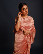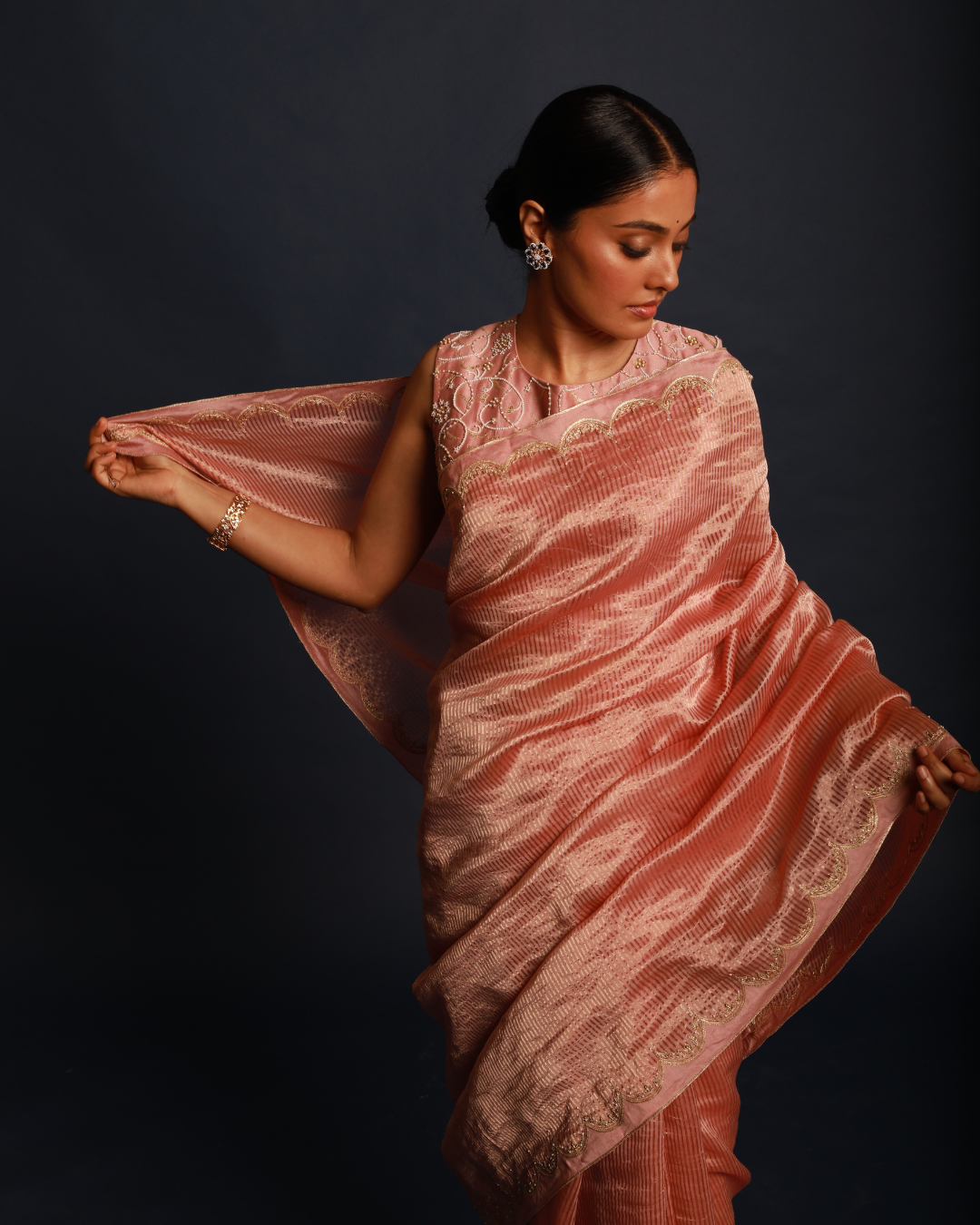 Featured here is our classic salmon pink striped saree in tissue chanderi with hand embroidered details on the edges and is paired with salmon pink chanderi blouse with moti work all over.
