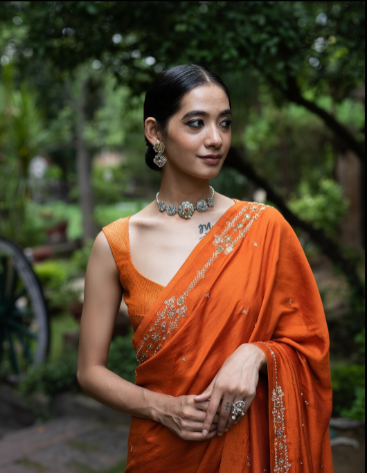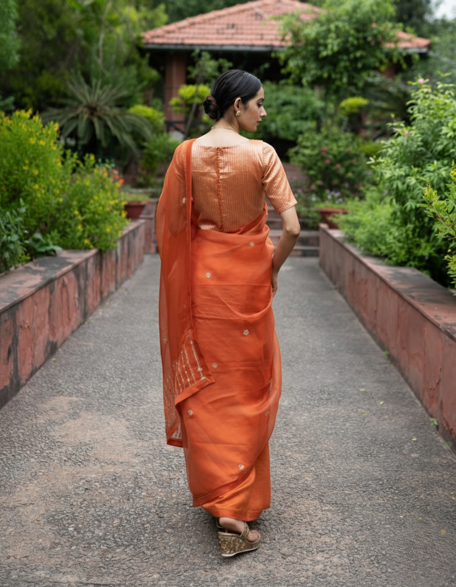 Rust Orange Half Silk & Half Organza Saree With Blouse