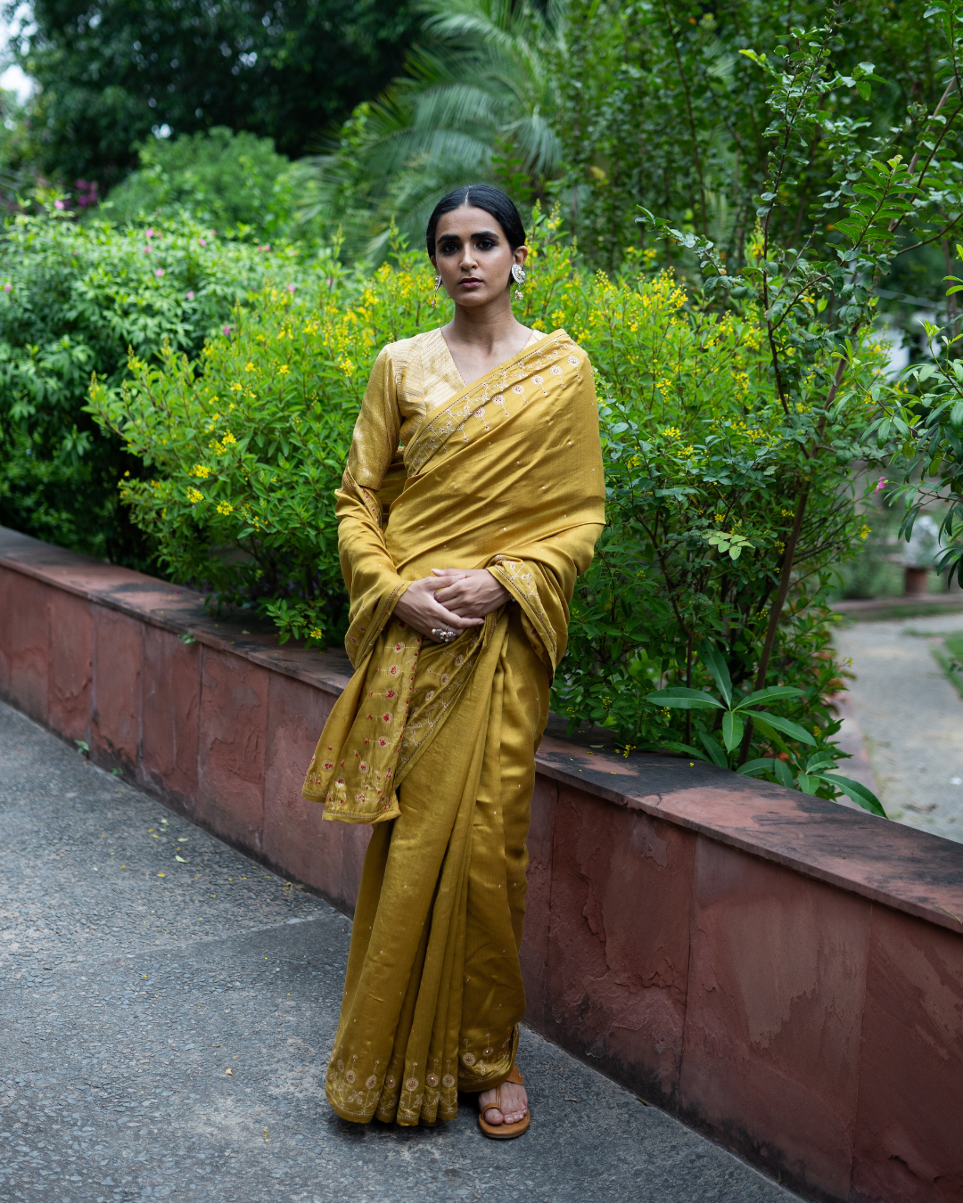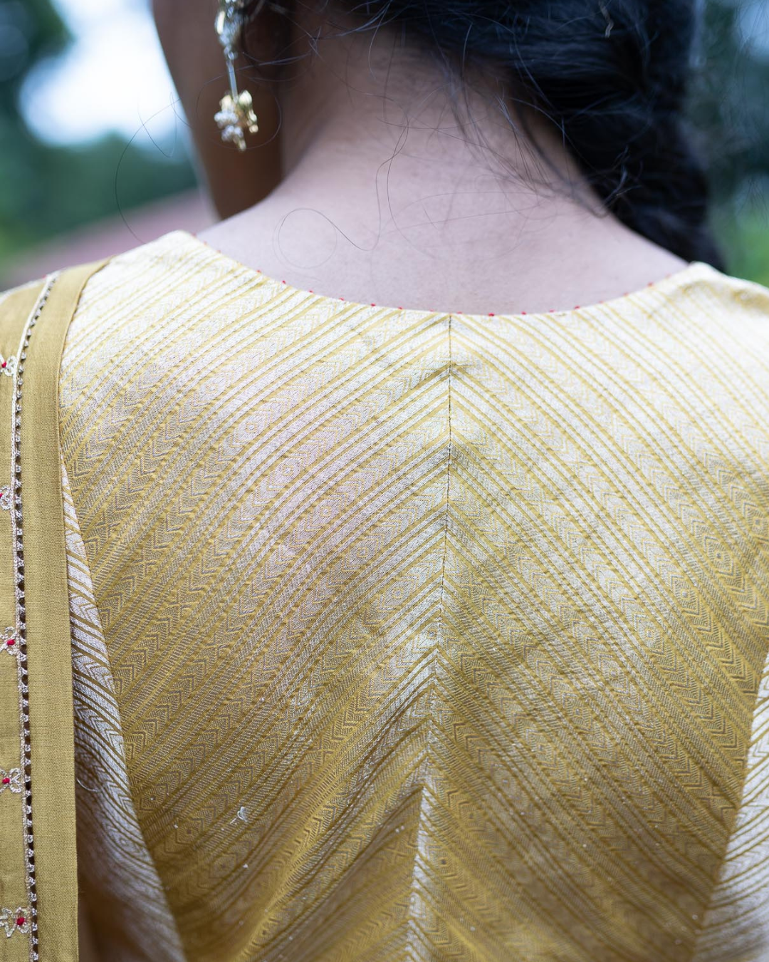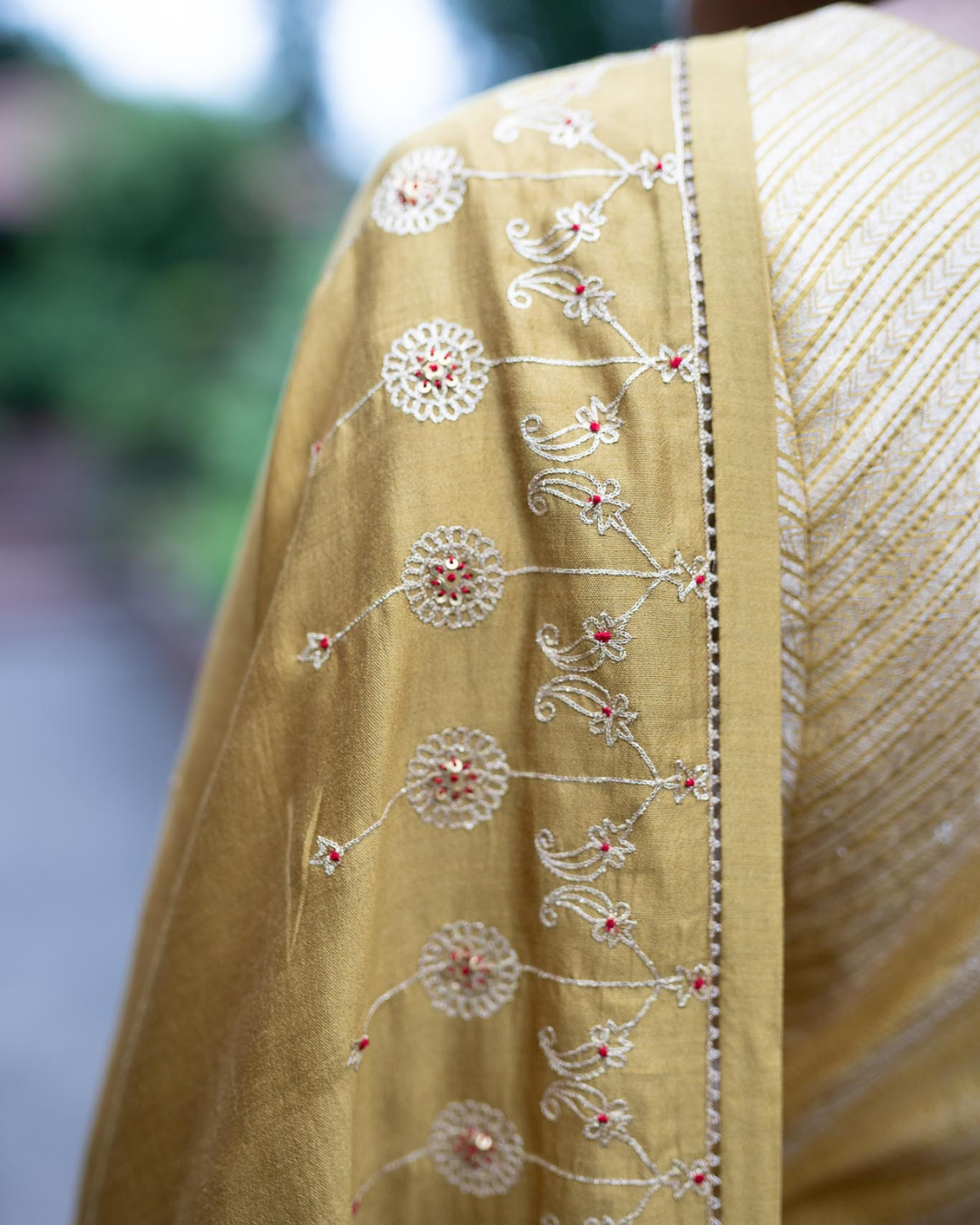 Featured here is our Molten Gold Yellow Silk Saree embroidered with aari and zardosi, The saree is paired with banarasi striped blouse.
