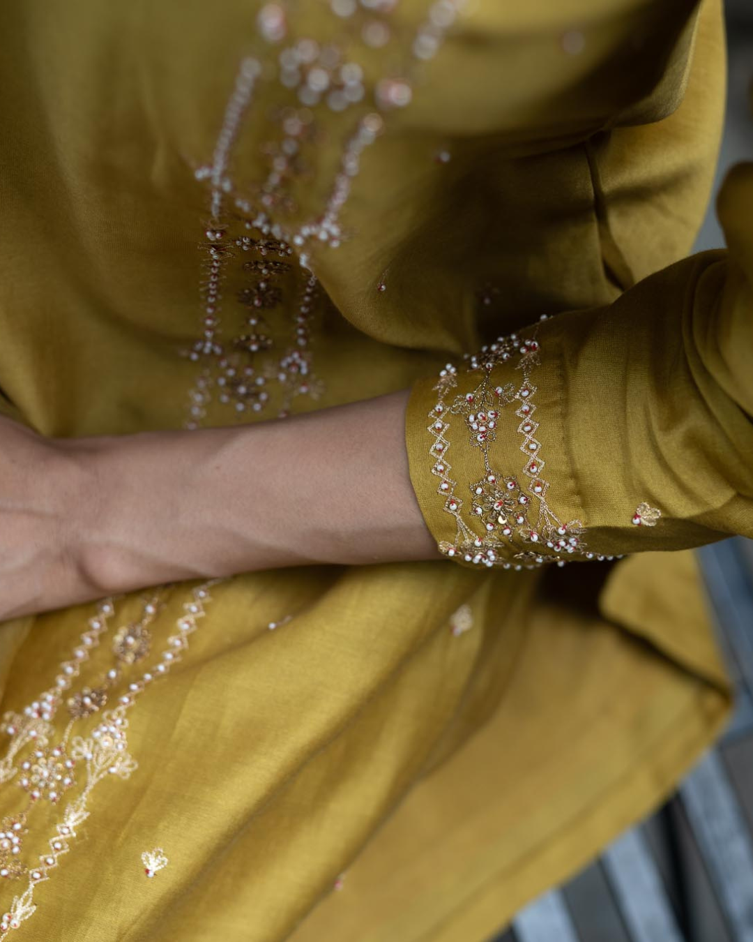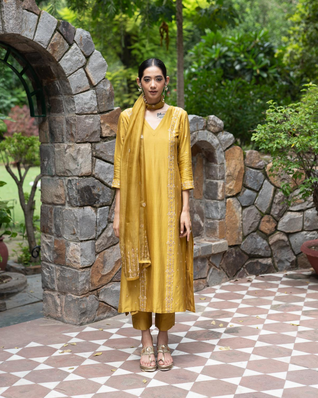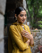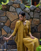 Featured here is our Molten Gold Yellow Straight Fit Kurta with embroidery on princess line. The kurta paired with straight pants and hand embroidered organza dupatta.