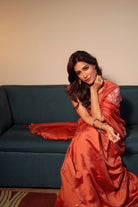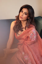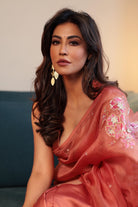 Description: Rust orange half and half saree is made by joining silk and organza for a smooth drape. It features printed pink applique flowers with Zari aari hand embroidary with detailed hand finished border.