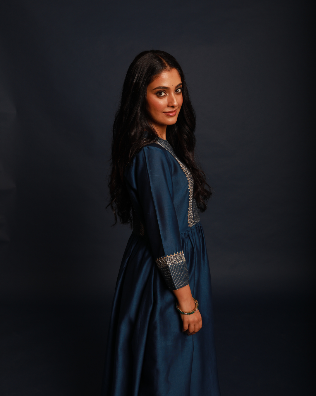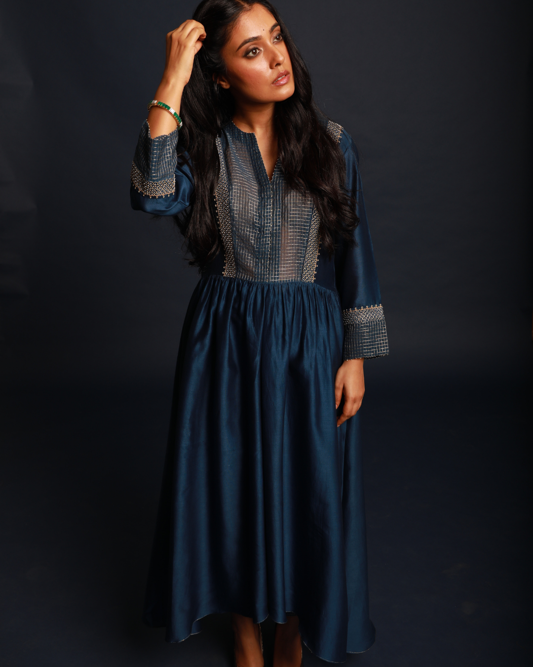 Featured here is our deep blue classic kurta designed with gathers on the waist and contrast yoke is a comfortable silhouette for the festive season. The kurta is detailed with fine aari and moti work on the yoke and sleeves.