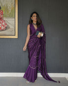 Description: Pavitra Sagar in sari with a masterful blend of tradition and craftsmanship, featuring a violet ada line enhanced with intricate phool pathi hand embroidery.