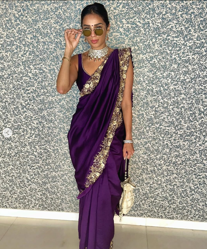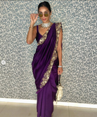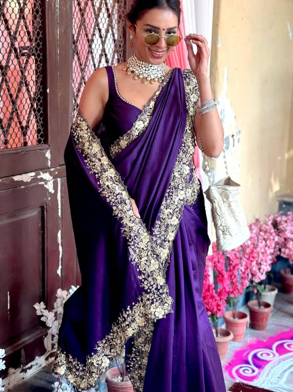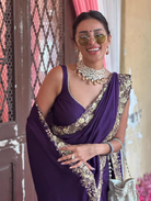 Description: Featured here is our hand embroidered saree in purple with an intricate embroidered border all over. The saree is paired with a sleeveless blouse.