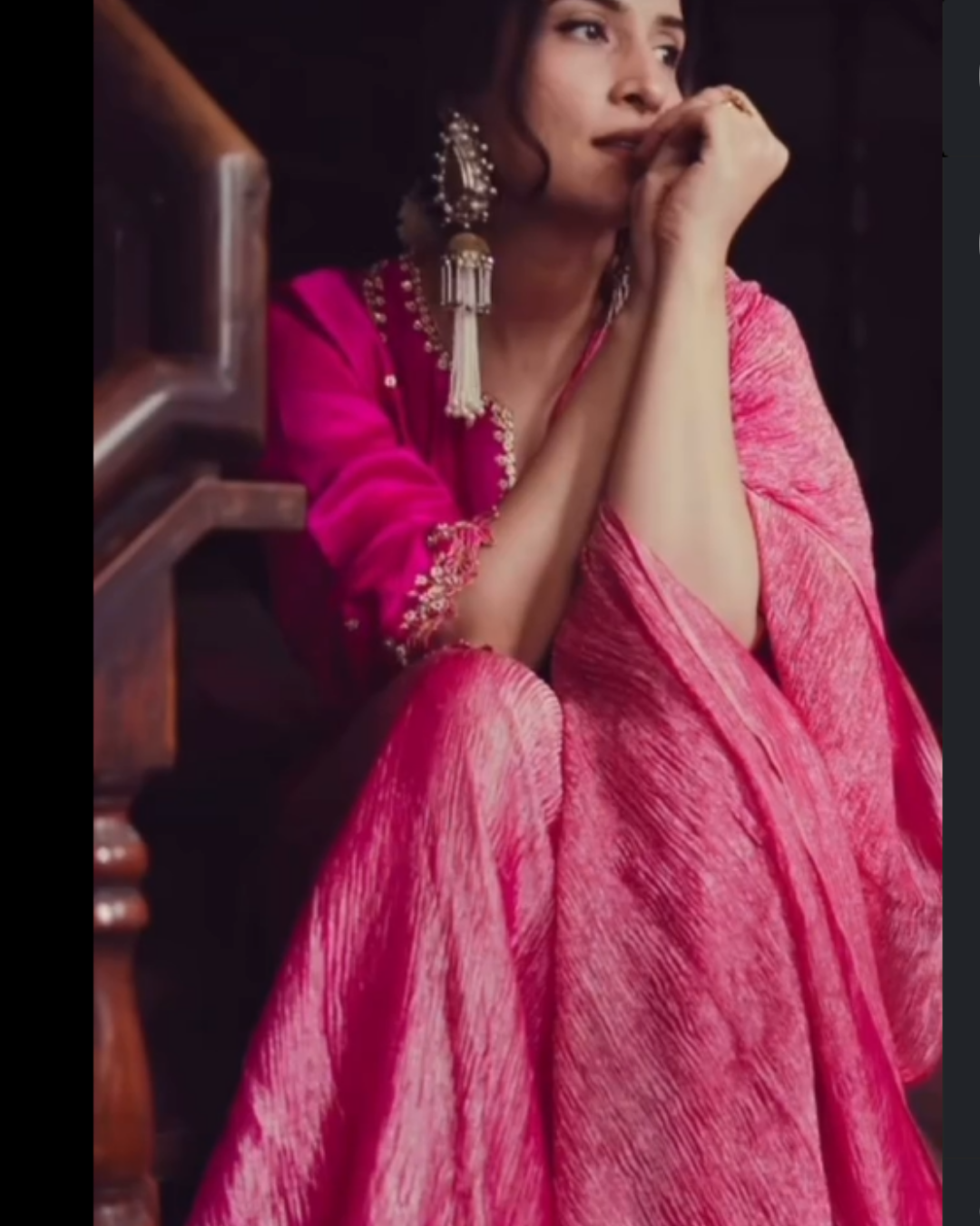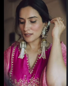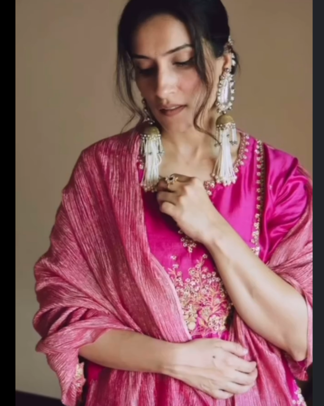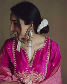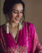 Description: Featured here is our Fuchsia kurta with intricate hand embroidered yoke and sleeves. The kurta is paired with a shirred metallic sharara and organza dupatta.