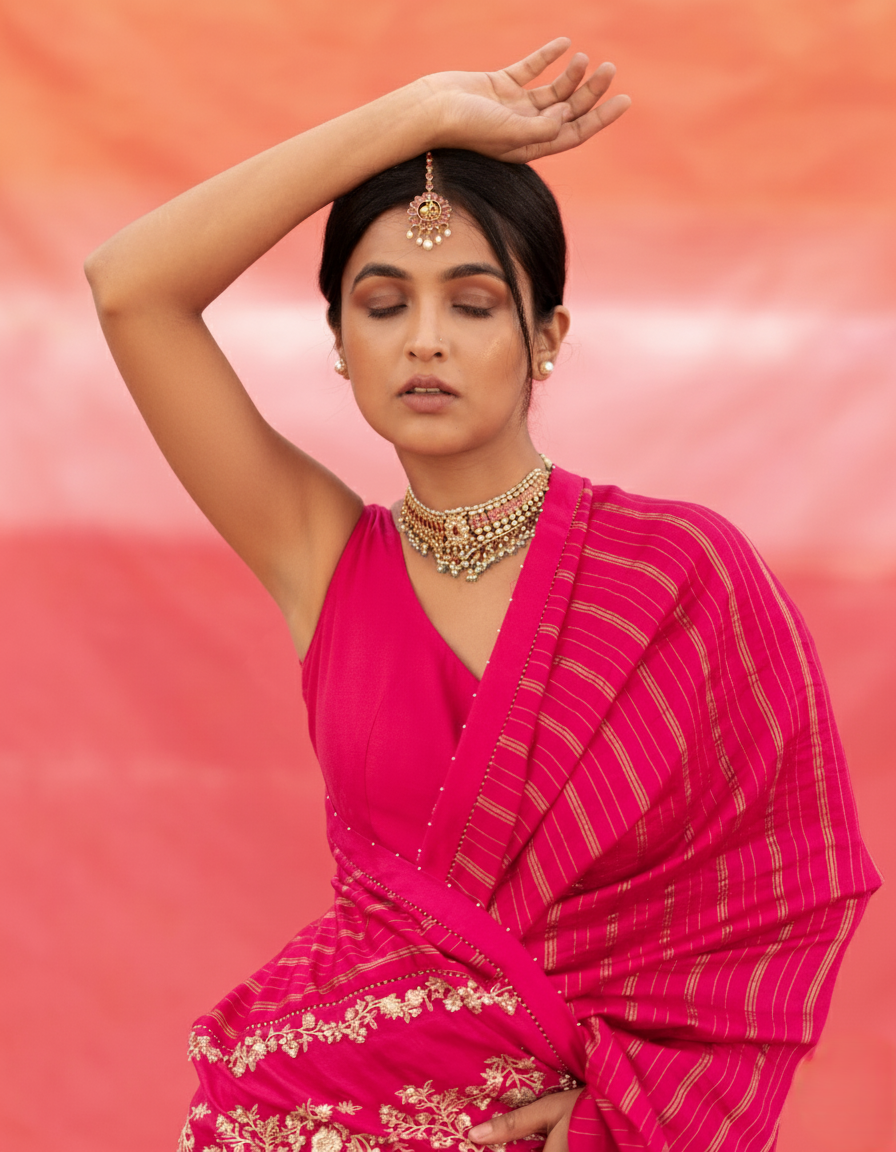 Fuchsia Hand Embroidered Striped Saree with Blouse