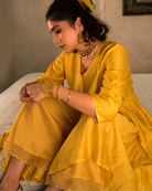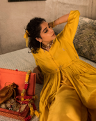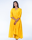 Featured here is our mustard gathered dress with gather details on the waist and asymmetrical hemline. The dress is paired with a straight fit trousers.