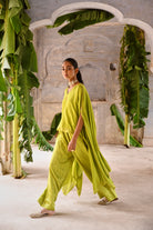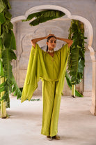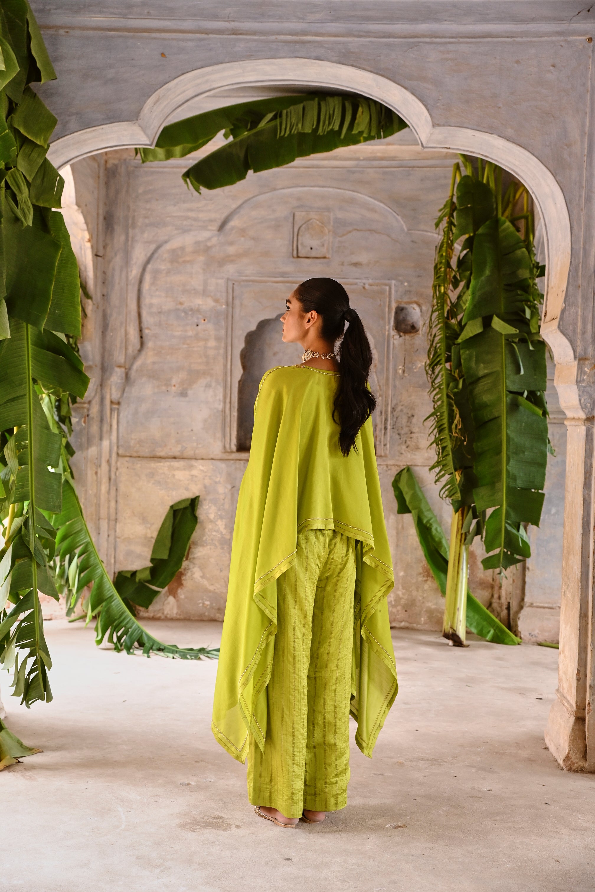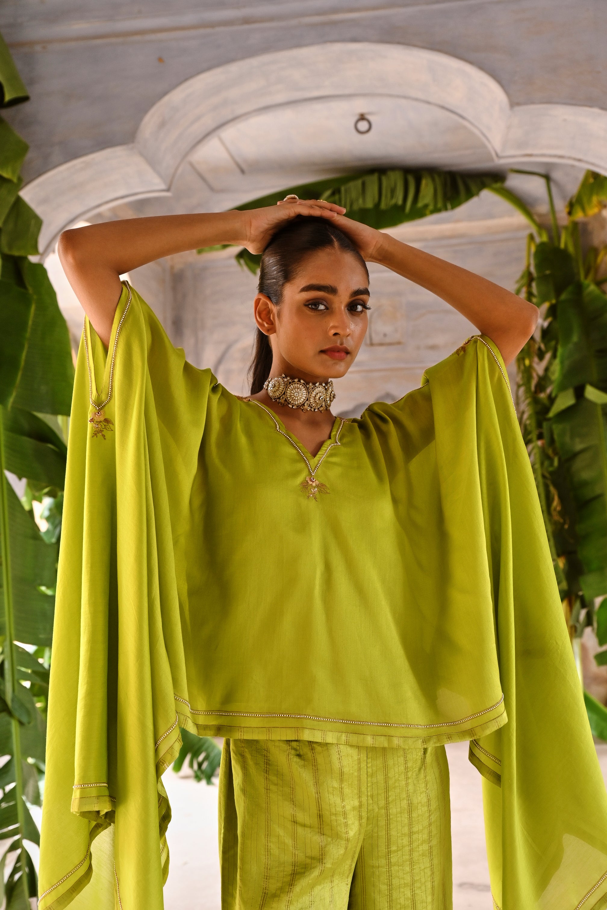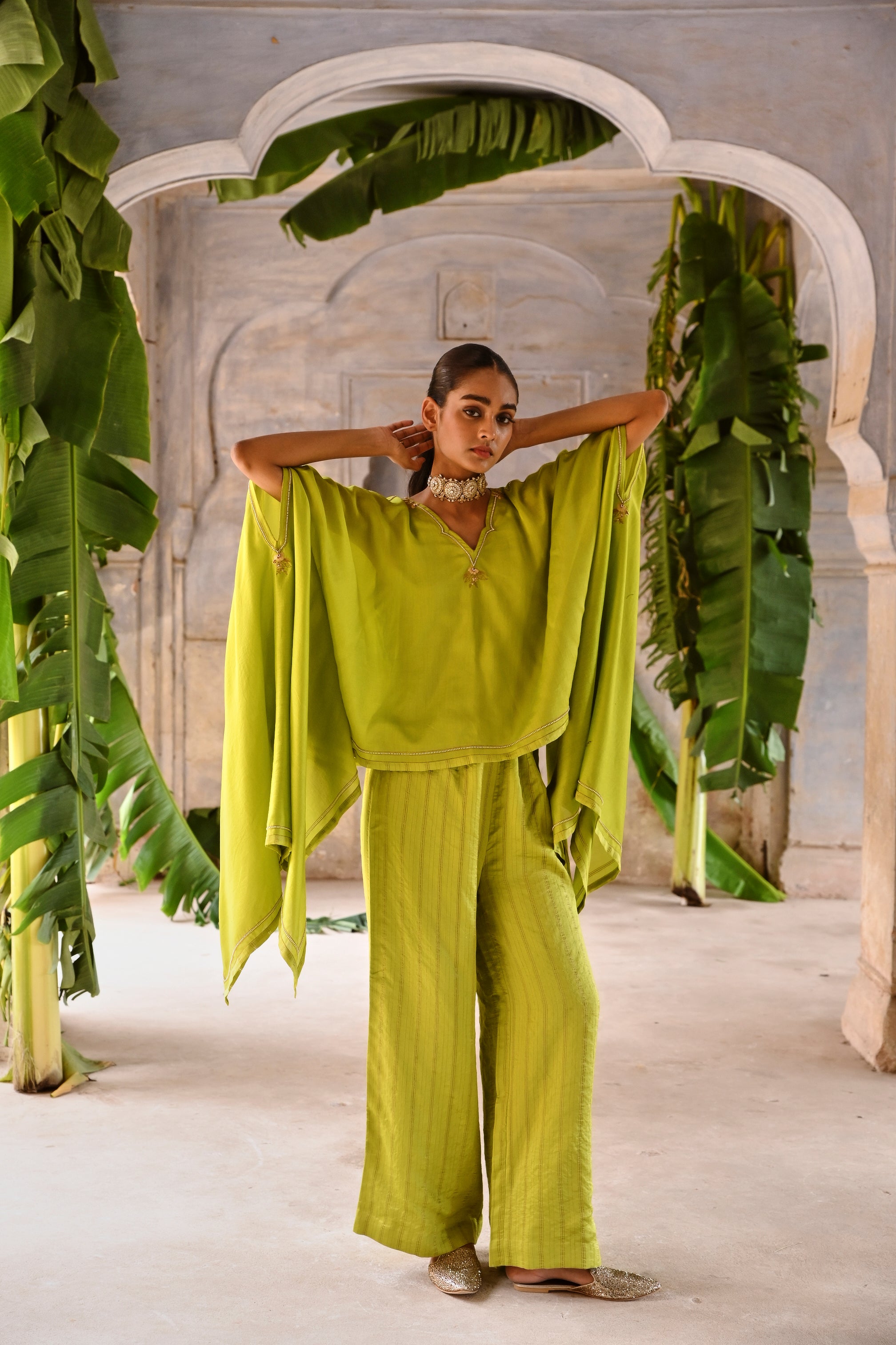 Description: Featured here is our best seller lime green kaftan top with embroidered neckline and sleeve and is paired with striped trousers
