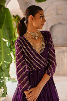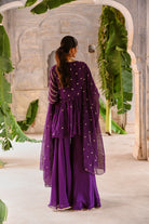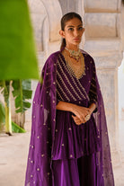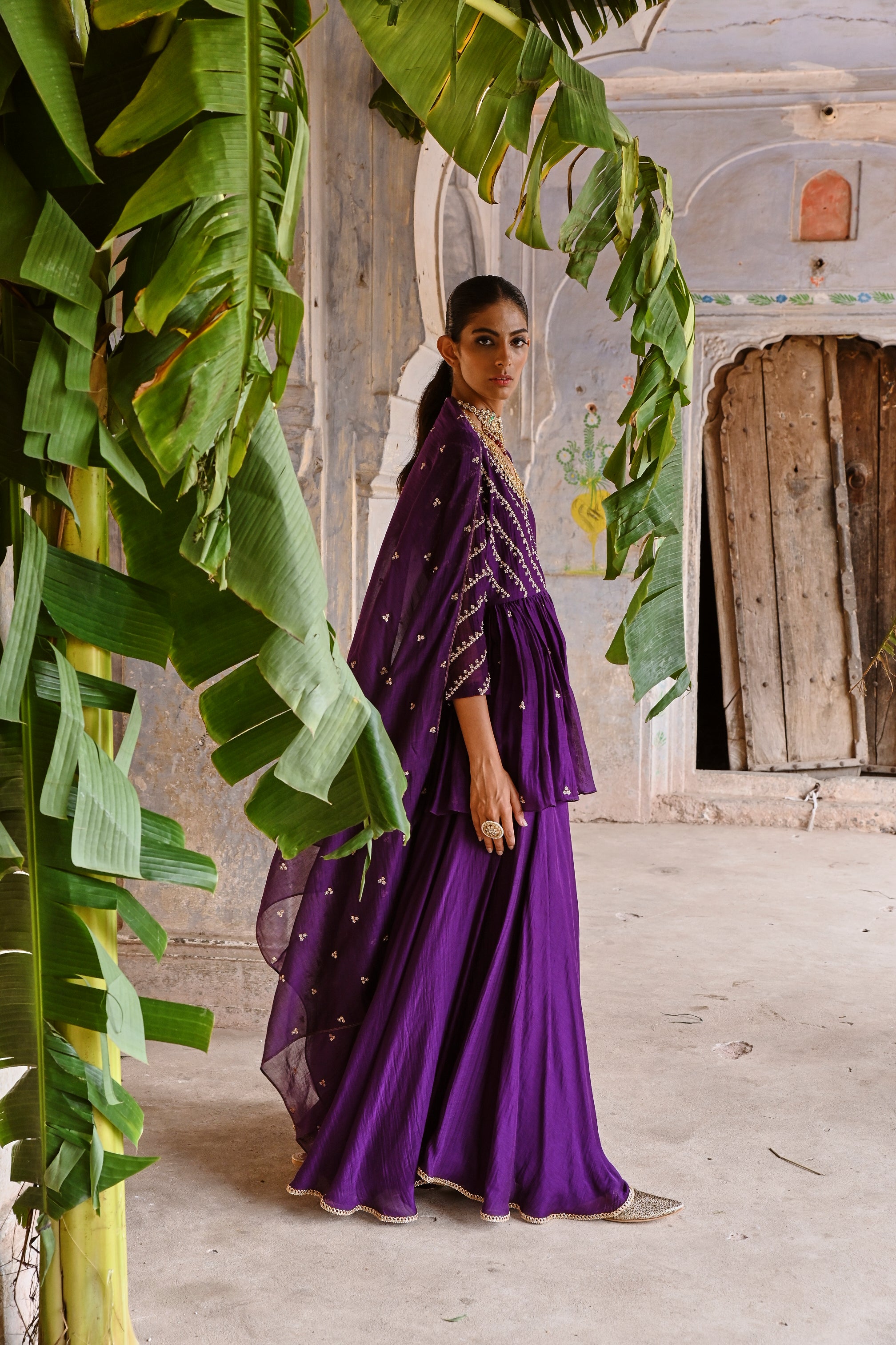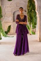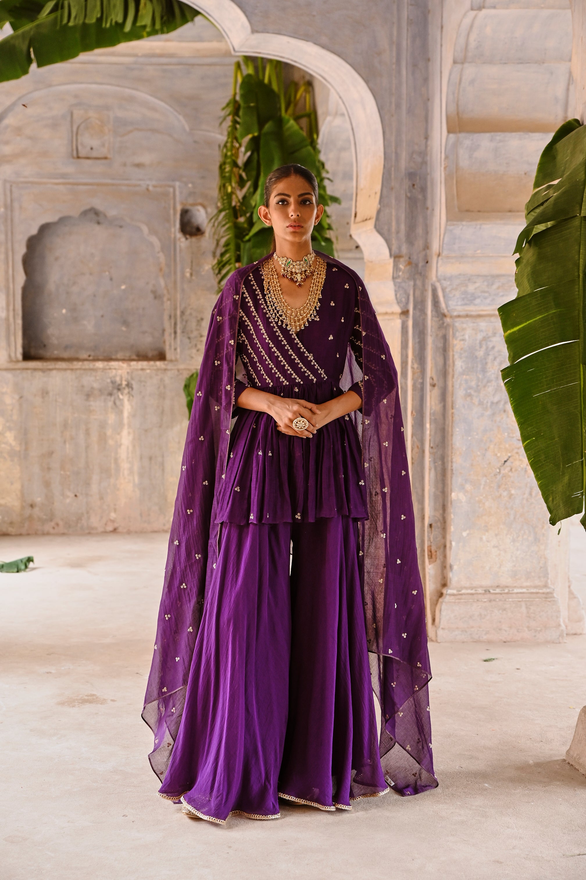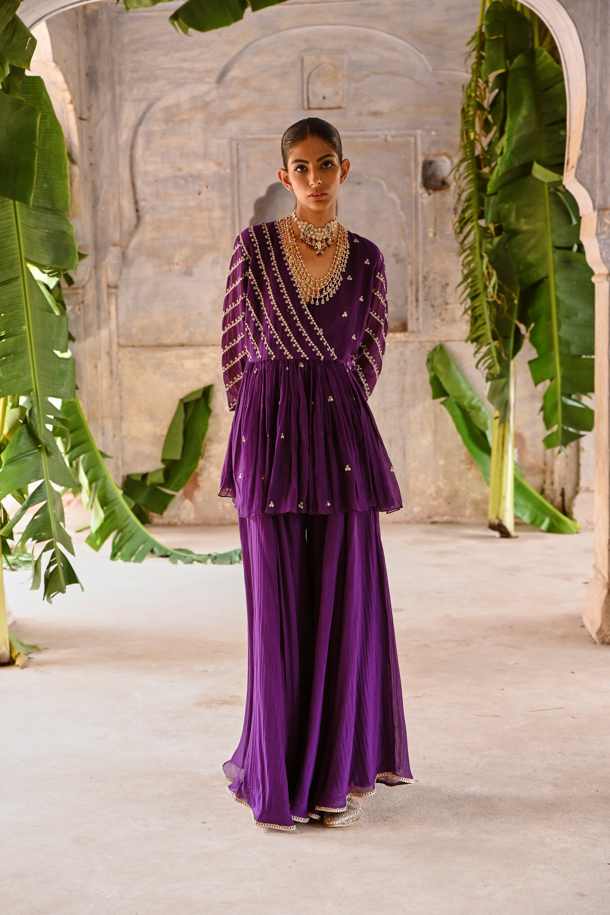 Description: Featured here is our purple short peplum top with hand embroidered vertical lines paired with a flared Chanderi trousers and dupatta.