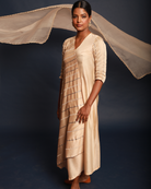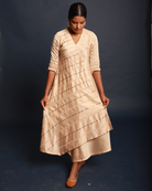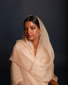 Featured here is our almond cross over kurta with asymmetric hem and handembroidered gota and moti details.The kurta is paired with straight fit trousers and organza dupatta with scalloped edges.