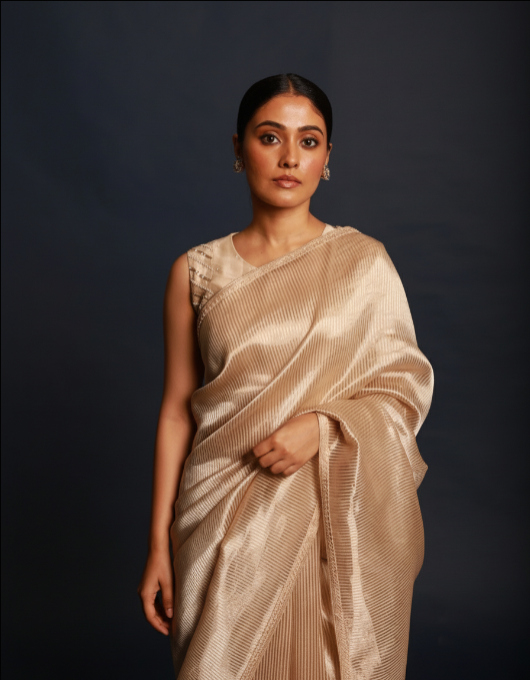Description: Featured here is our almond zari tissue saree which is paired with geeta blouse embroidered with gota and moti work.