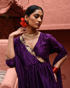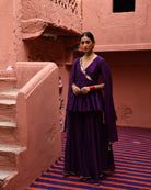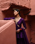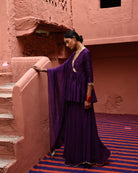 Description: Featured here is our signature aubergine short peplum top with embroidered neckline and is paired with a flared trousers and chanderi dupatta.