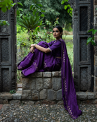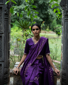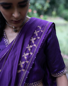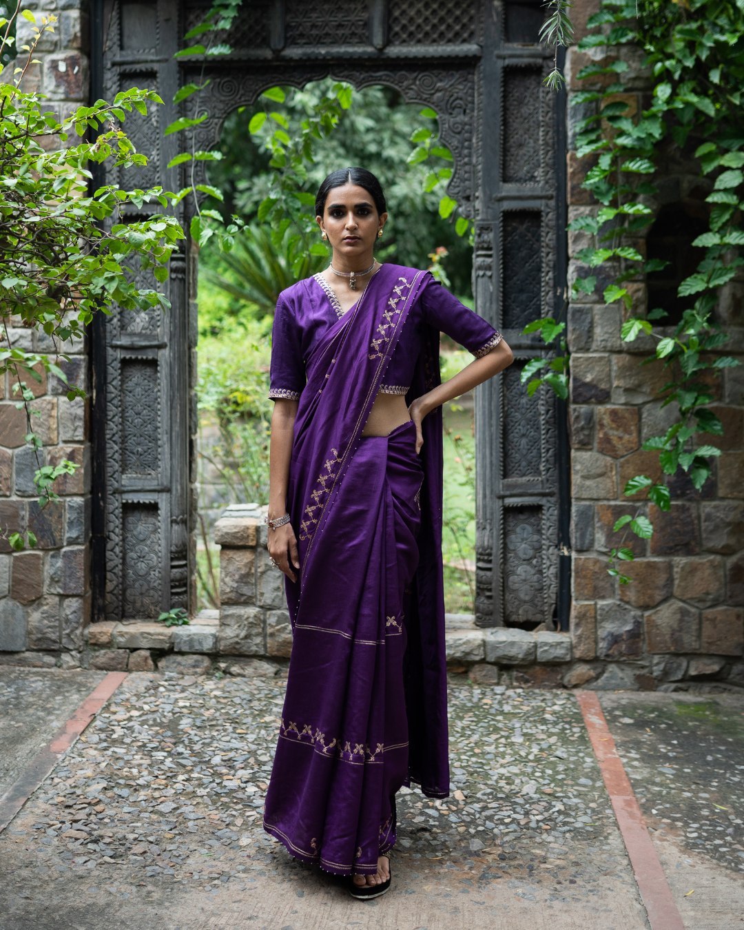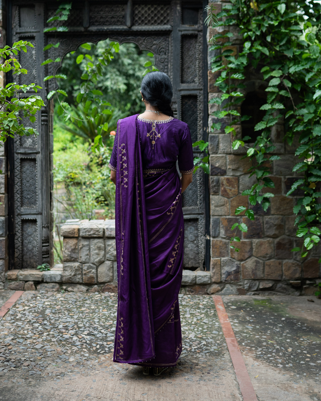 Featured here is our signature Aubergine Silk Saree with details of zari and pearl embroidery throughout.