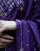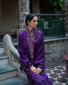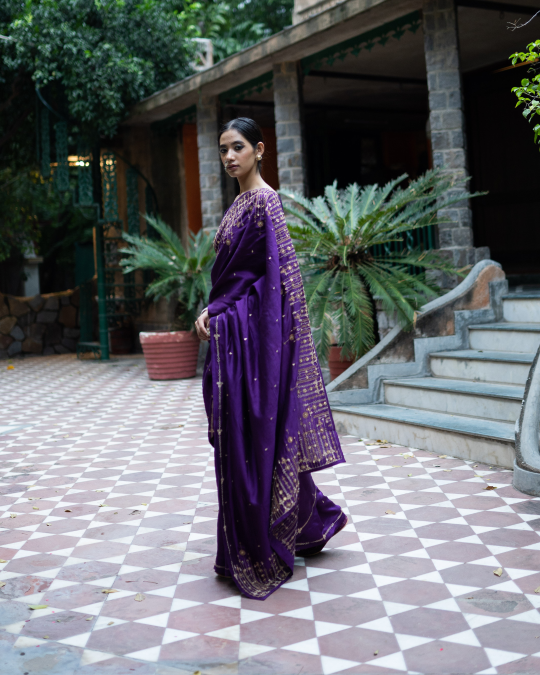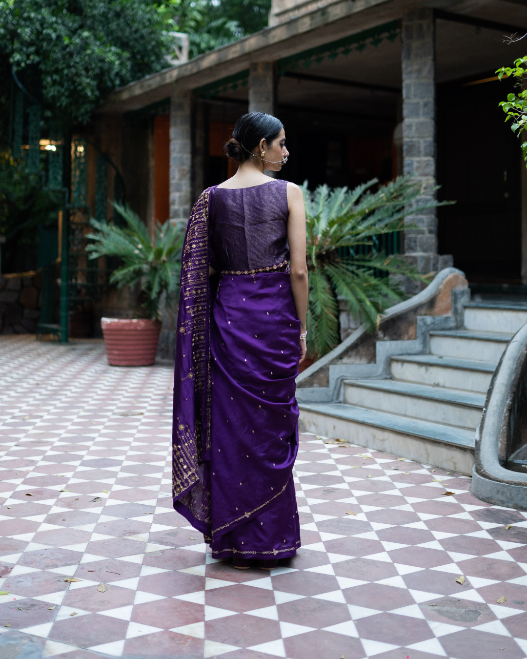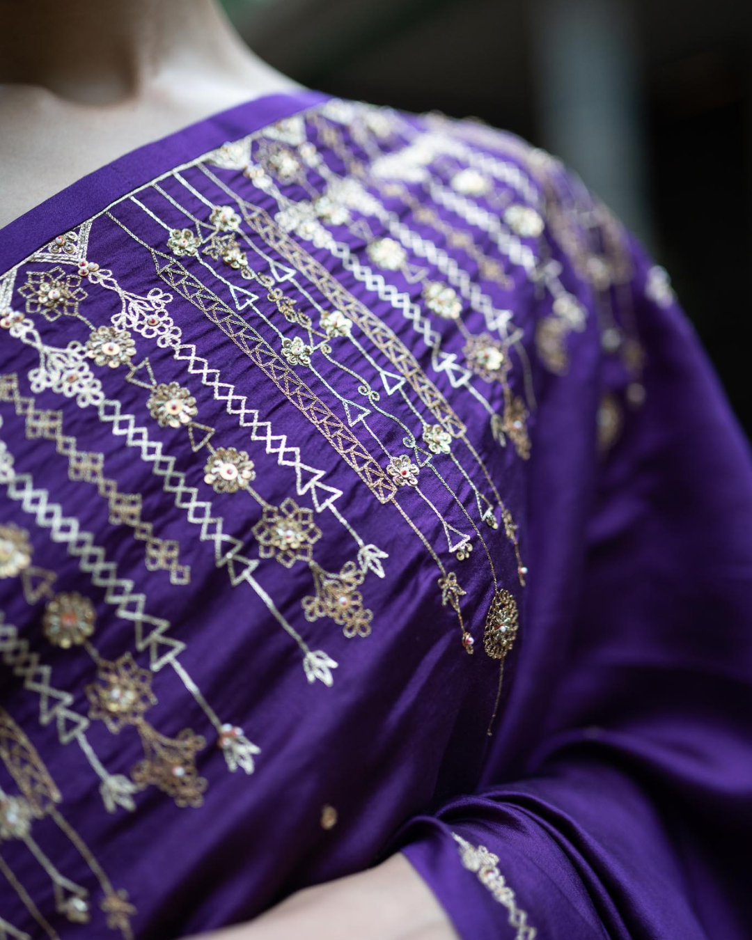 Featured here is our signature Aubergine Silk Saree with intricate details of zari and pearl embroidery on the saree hem and palla.