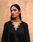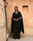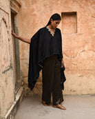 Description: Featured here is our black cape top with embroidered neckline. The top is paired with flared striped tissue trousers.