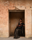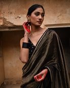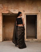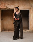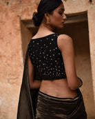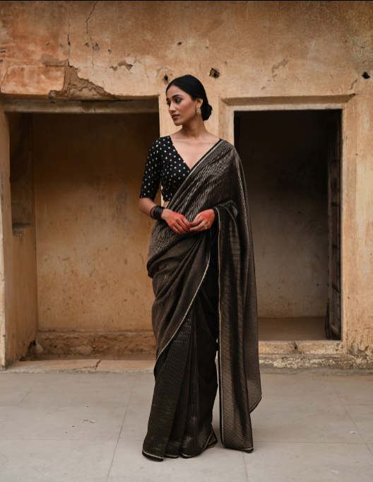 Description: Featured here is our black saree with stripes over all. The saree is paired with a V neck sleeveless blouse.