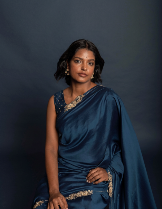 Description: Featured here is our deep blue silk saree with cutwork floral details on the border of the sari and is paired with deep blue blouse with aari work overall.
