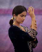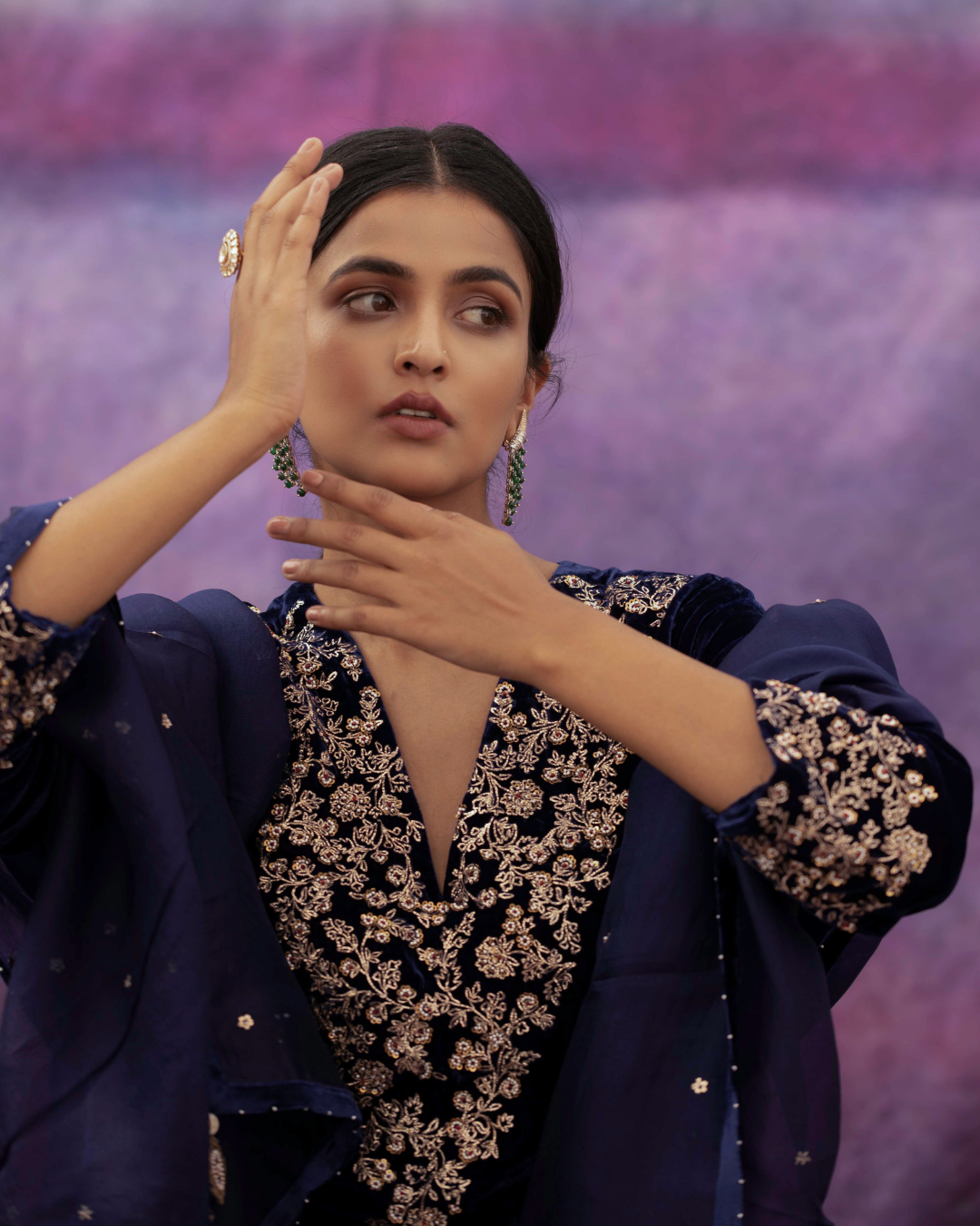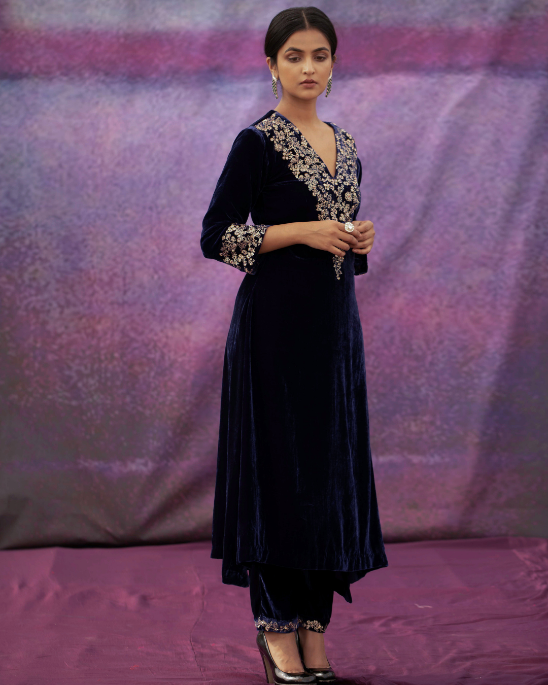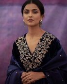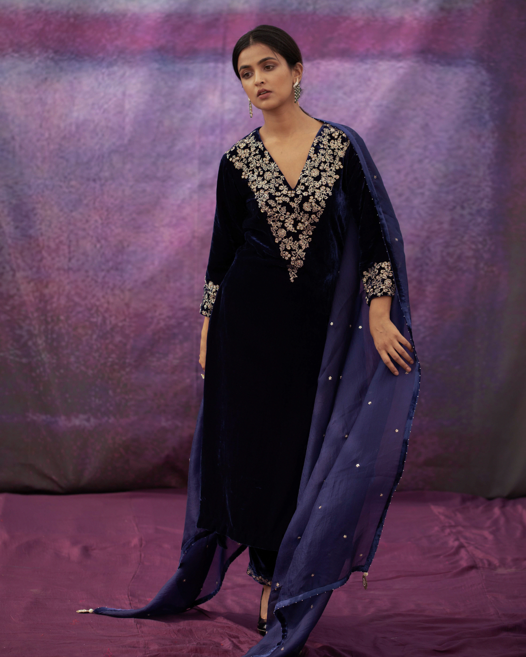 Blue Hand Embroidered Velvet Kurta is an absolute delight to wear, adorned with fine aari and moti work in the yoke & sleeves. The kurta is paired with velvet straight fit trousers and organza dupatta.