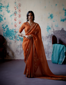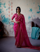 Description: Blush pink saree, crafted from organza and silk, showcases intricate phool jaal embroidery throughout. It is enhanced by a finely detailed aari and moti embroidered border. Complementing the saree is a V-neck silk blouse adorned with subtle embroidery, creating an elegant ensemble.