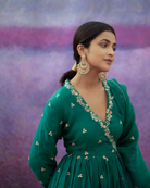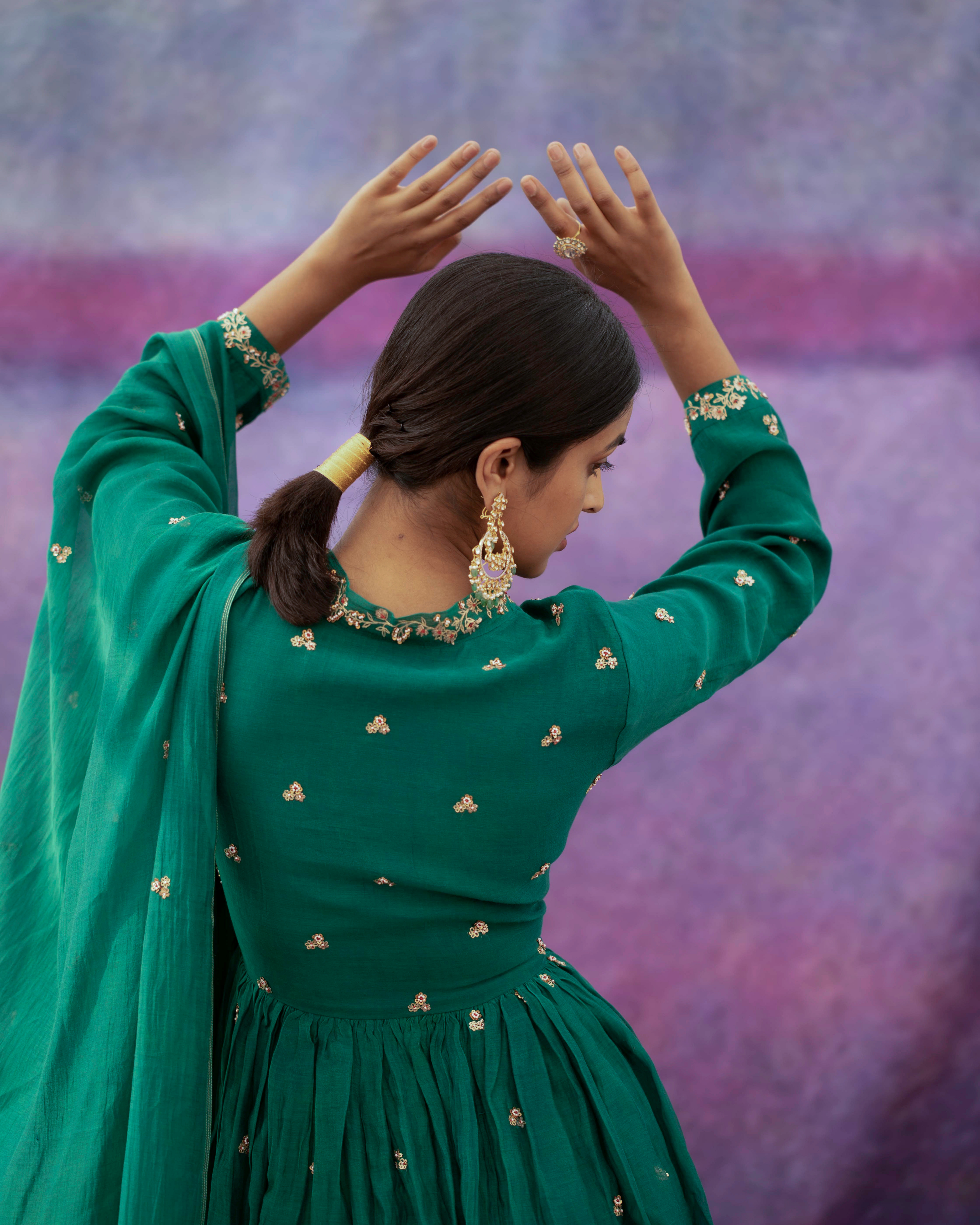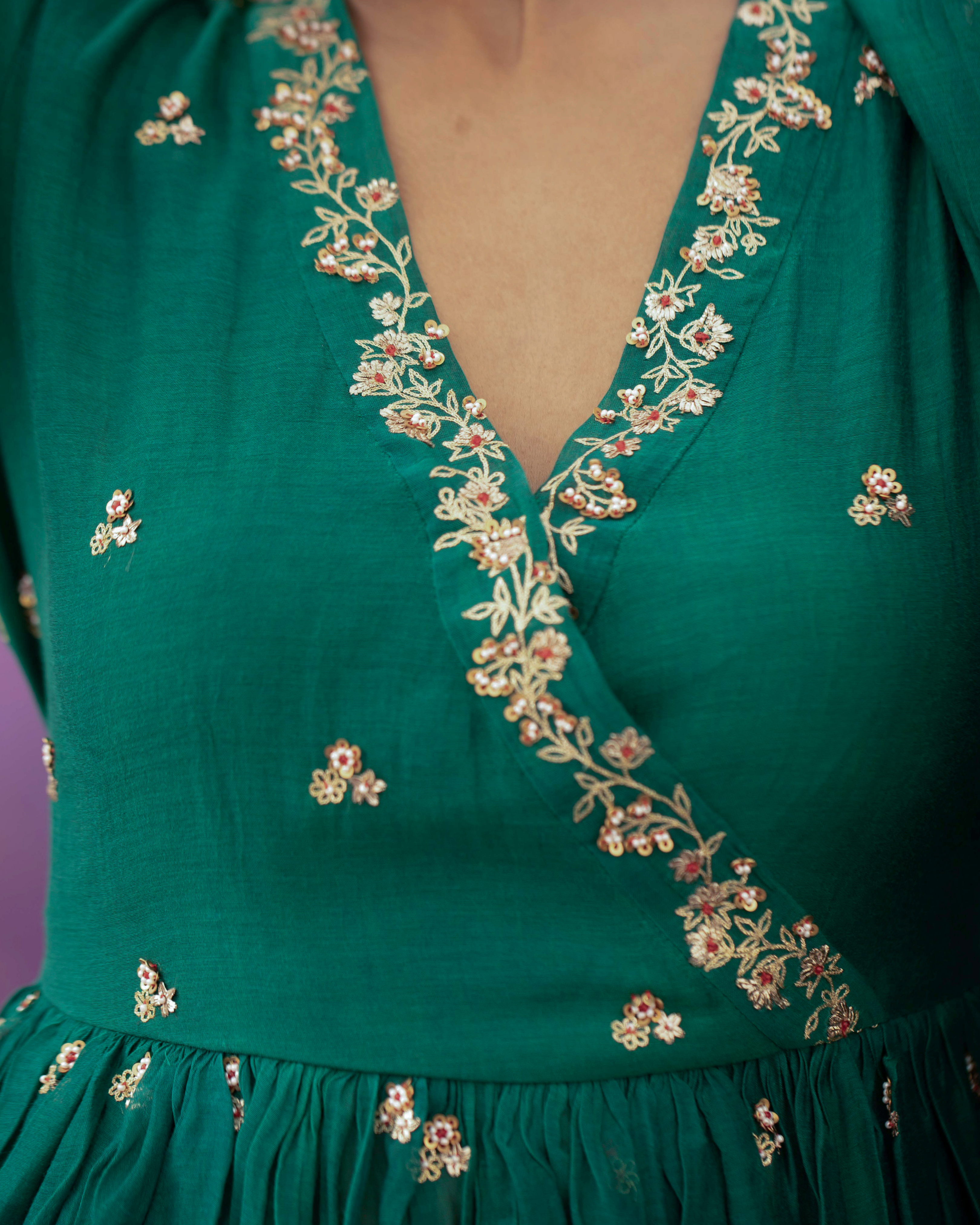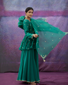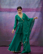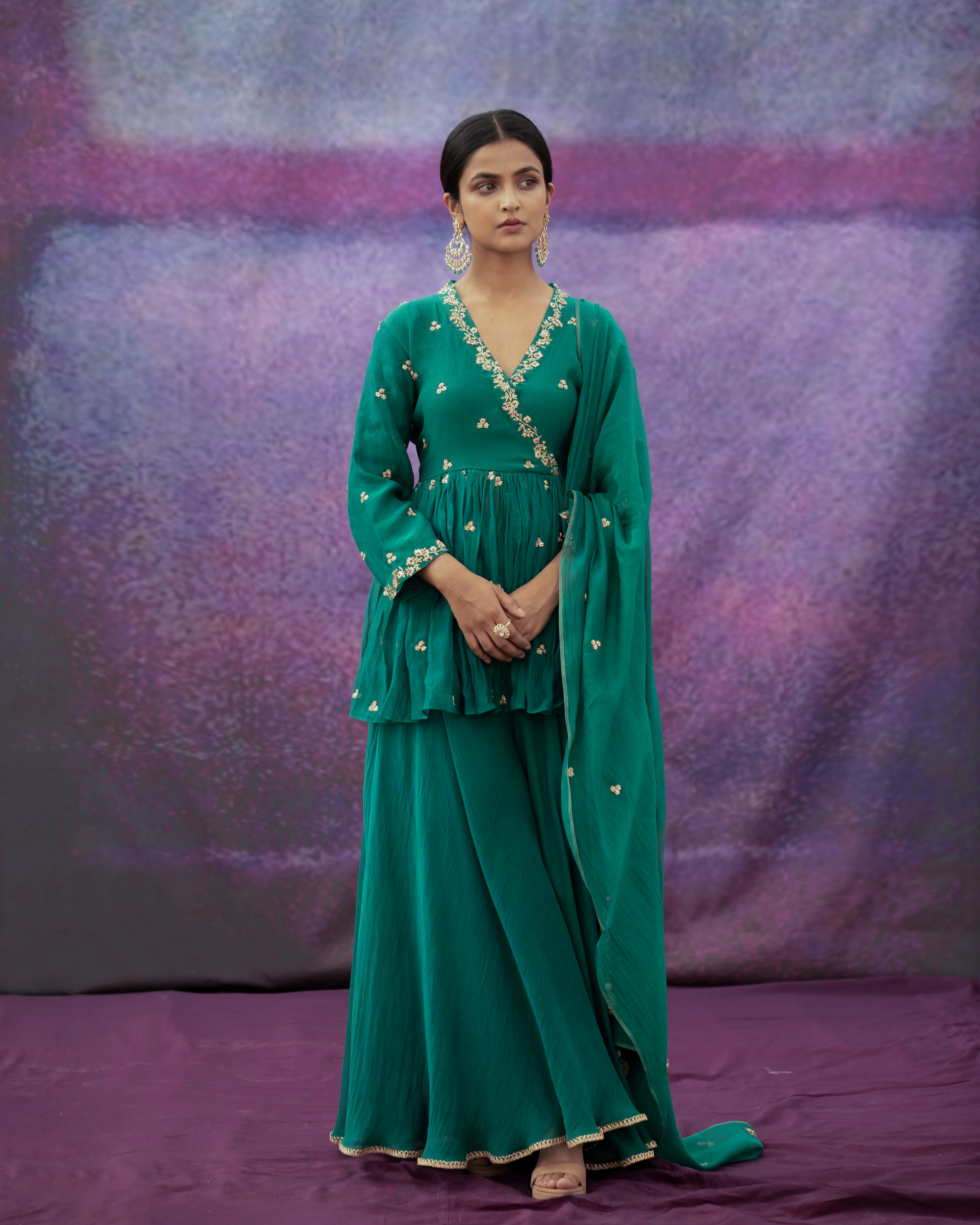 Green Short Angrakha & Sharara Set is a contemporary take on shararas, the top has a tie detail on the side and has intricate aari and moti work. The top is paired with a green chanderi sharara with gold border and chanderi dupatta.
