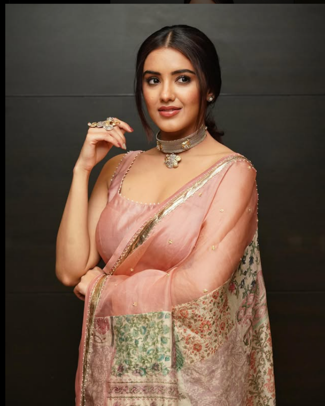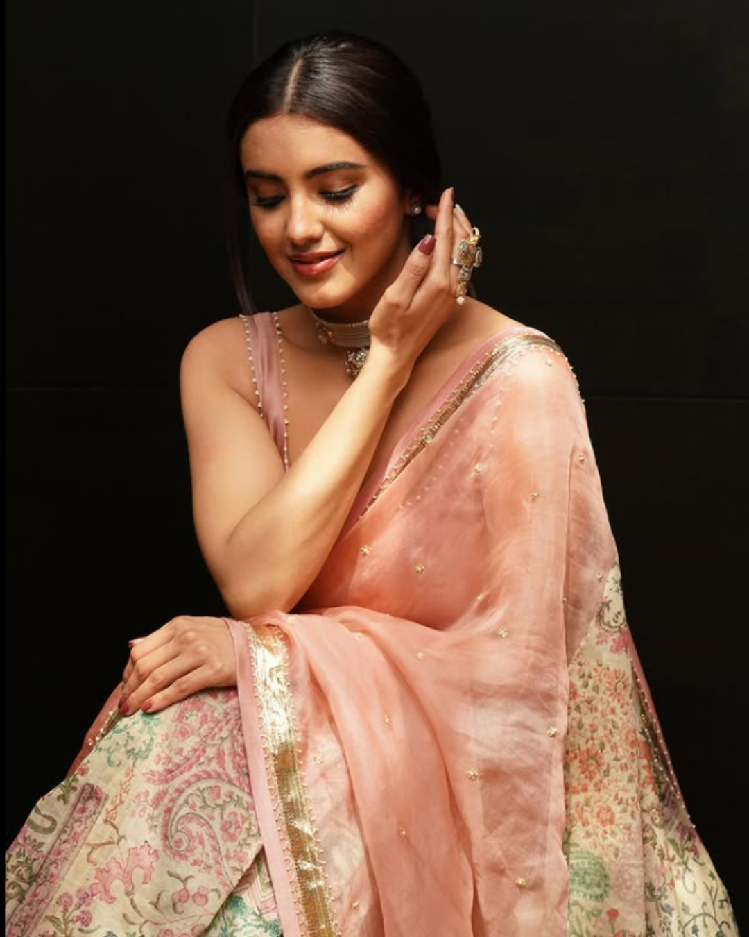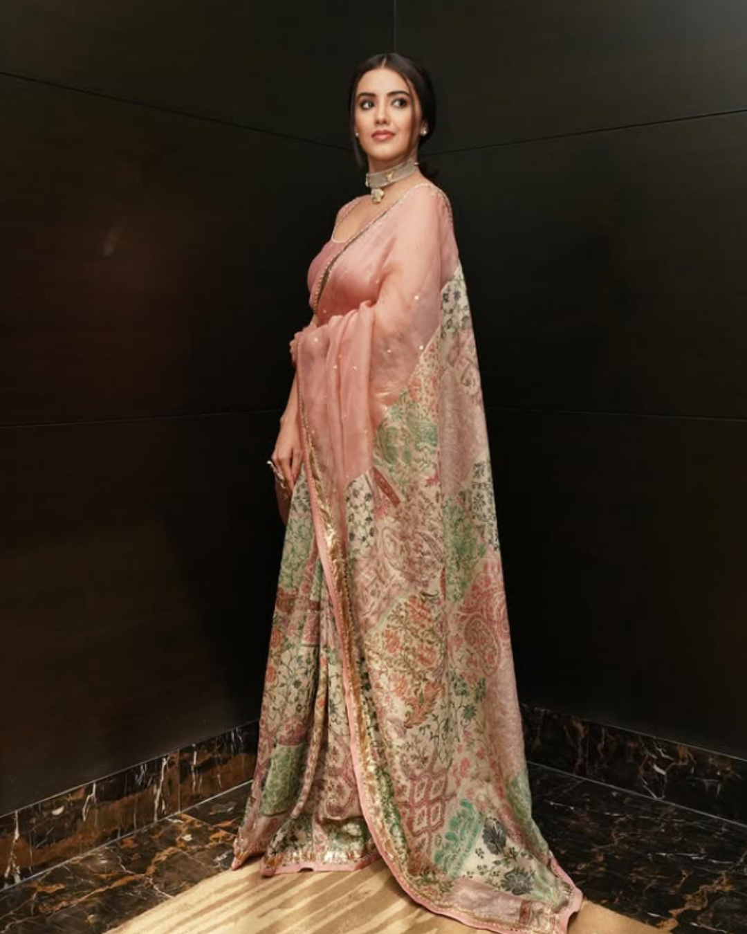 Description: Featured here is our mix print saree with organza hand-embroidered in gota, zari, and moti which comes with a hand embellished blouse.