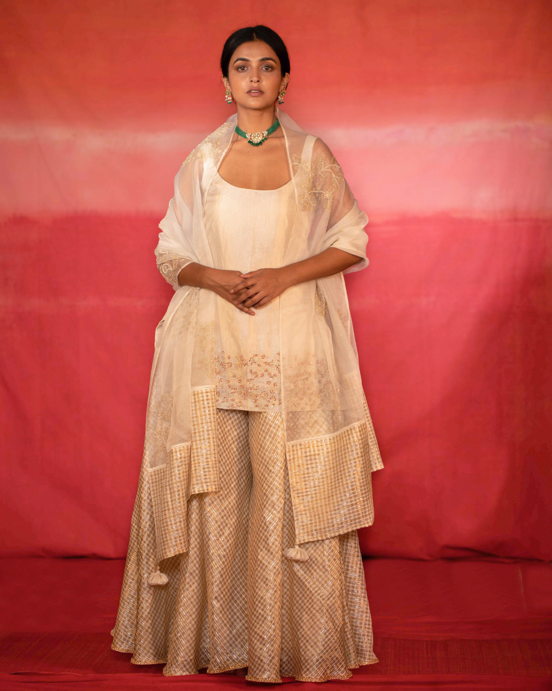 Featured here is our silver toned metallic short sleeveless kurta paired with checkered flared sharara pants in tissue.