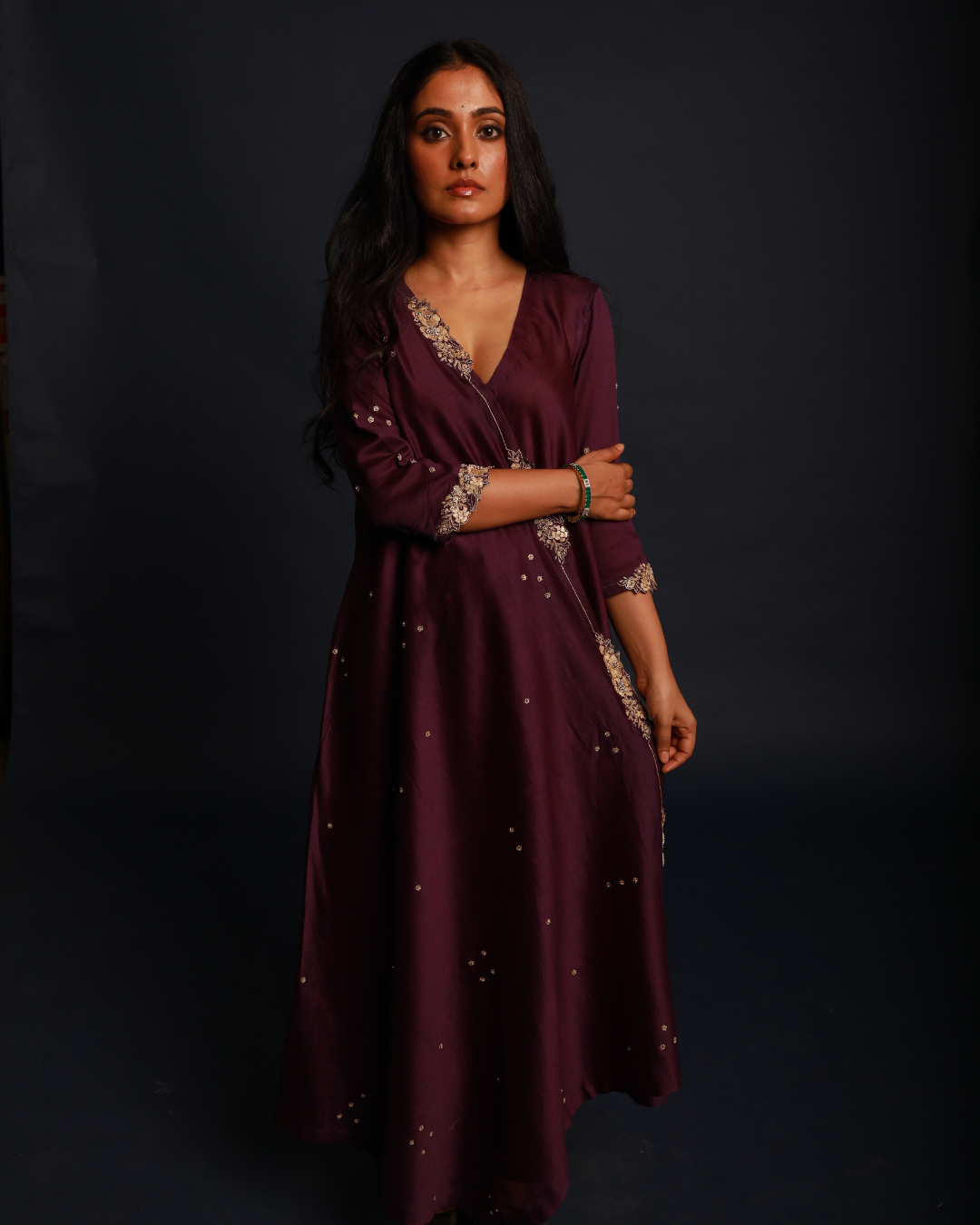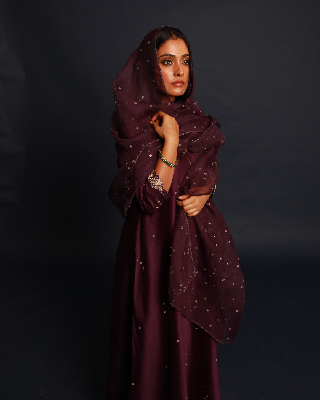 Featured here is our burgandy angarkha kurta with floral motifs on the neck and buttis all over. The kurta is paired with straight fit trousers and organza dupatta with hand embroidered buttis al over.