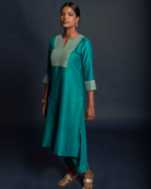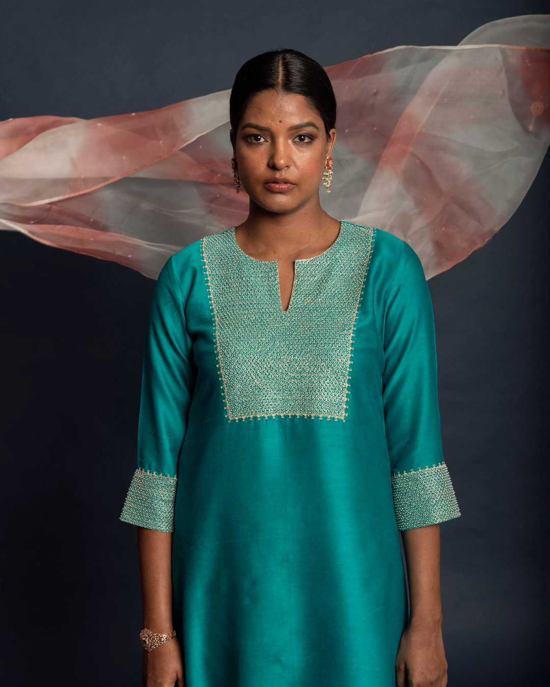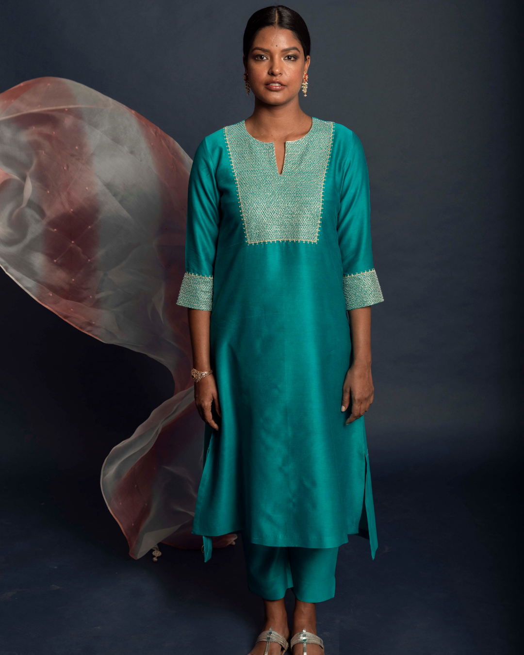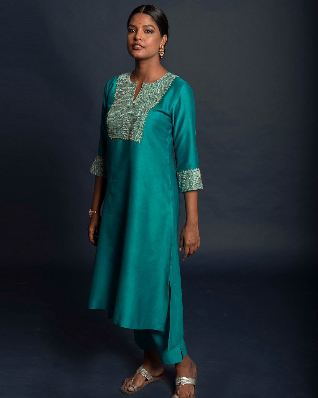 Featured here is our classic straight fit kurta with asymmetrical hem in turquoise with moti embellished yoke and sleeve hem. The kurta is paired with turquoise trousers with side slit.