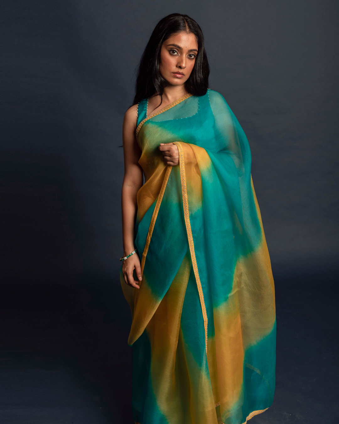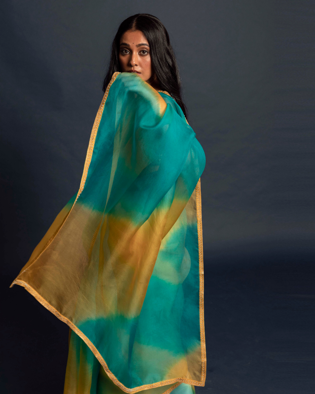 Description: Featured here is our yellow and turquoise ombre silk organza saree with embroidered details on the edges and is paired with turquoise sleeveless blouse with aari and moti work details.